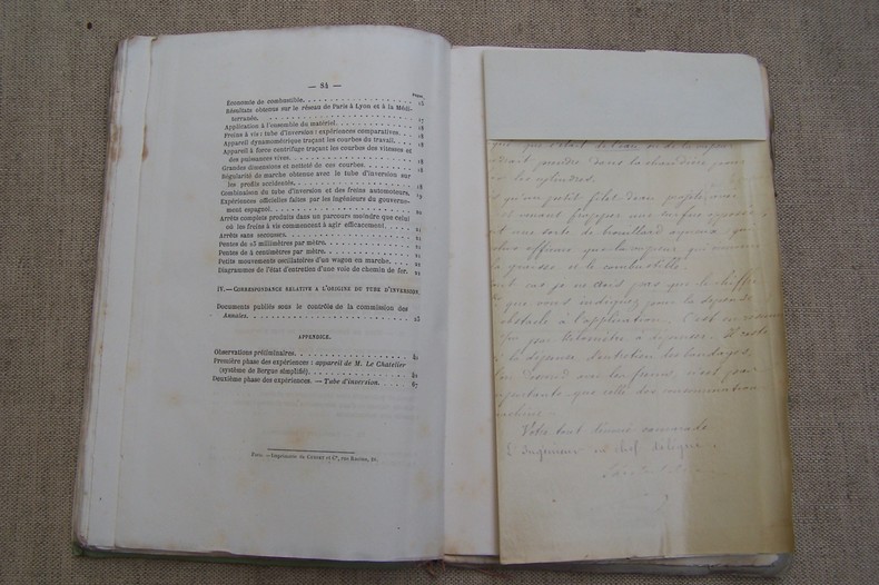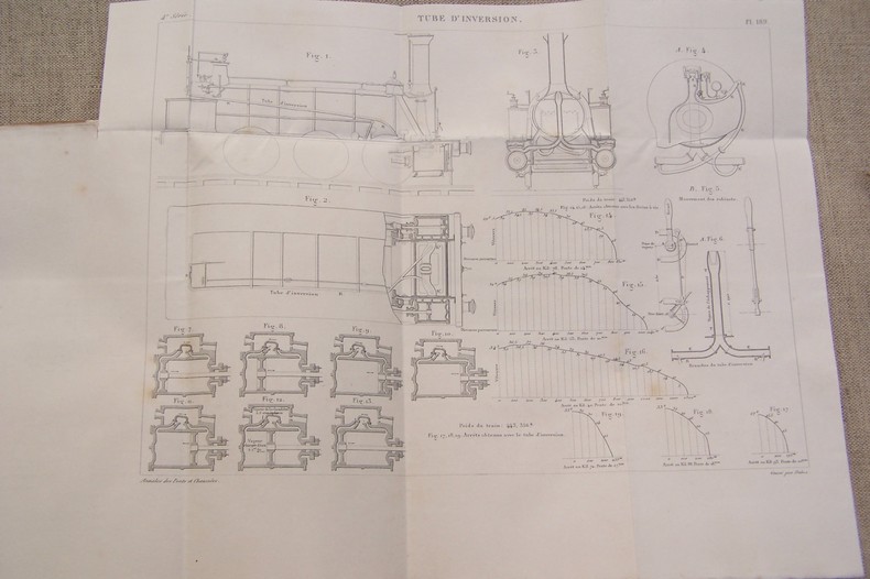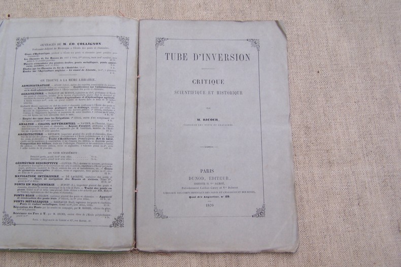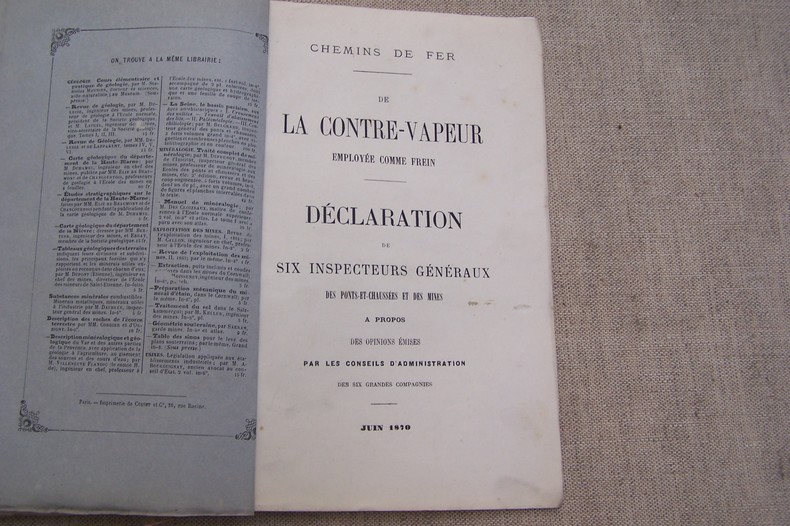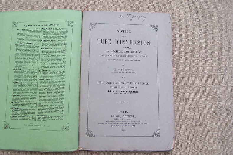 On joint deux brochures: Tube d'inversion, critique scientifique et historique par M. RICOUR. Dunod, 1870. In-8, 44 pages. De la contre-vapeur employée comme frein. Déclaration de six Inspecteurs Généraux des Ponts-et-Chaussées et des Mines (MICHAL, DE CAPELLA, DUPARC, L. LALANNE, E. DE HENNEZEL, COUCHE) à propos des opinions émises par les Conseils d'Administration des six grandes Compagnies. Juin 1870 In-8, 15 pages.
