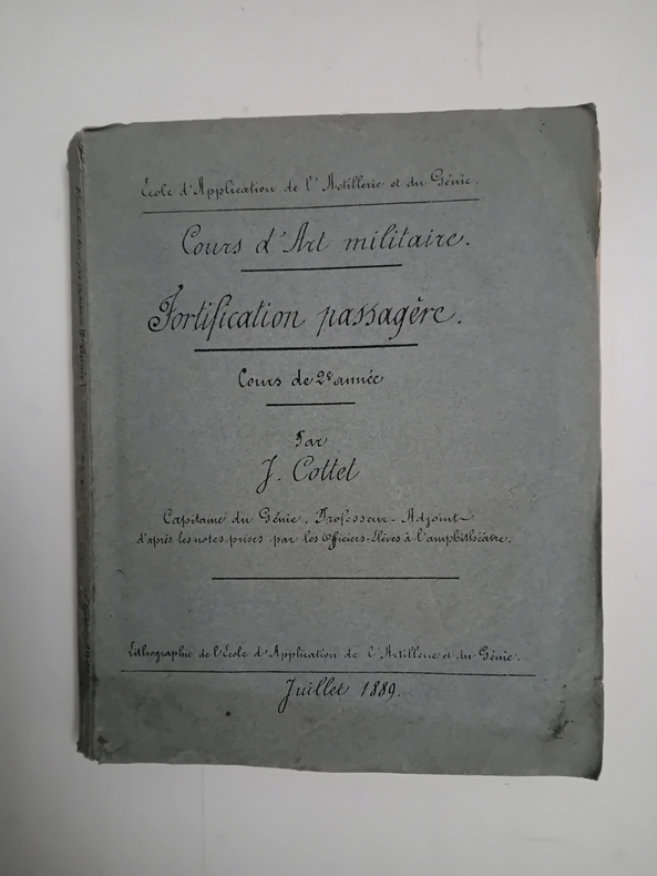 Ecole supérieure de guerre Paris, Ecole superieure de guerre, 1886 - 1887. In-4 relié demi-toile verte de 118 + 5 pages. Pièce de titre rouge et fleuron doré. Cours à destination des élèves de la 11ème promotion (1885-1887) de l'école suprieure de guerre. Exemplaire du lieutenant d'infanterie Bouyssou classé 48e de la promotion. Sommaire : Emploi de la fortification pour l'organisation d'un champ de bataille. Emploi de la fortification passagère au lieu et place de la fortification permanente dans l'organisation des positions d'arrêt et des places du moment. Etude comparée des principes relatifs à la fortification passagère, dans les diverses armées étrangères. Nombreux tableaux et croquis en noir dans le texte. Dos tâchée. Pièce de titre partiellement manquante. Rares passagère soulignés au crayon de couleur bleu. Rousseurs éparses. Bon état.