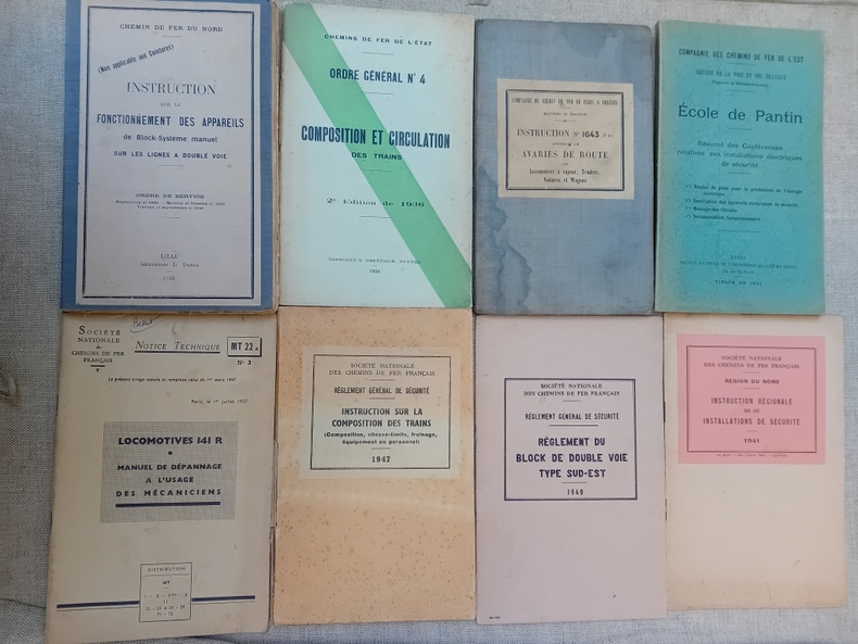 CHEMIN DE FER: Notices, livrets, brochures techniques: Instruction sur la composition des trains, S.N.C.F., 1947. Règlement du Block de double voie type Sud-Est, SNCF, 1949. Instruction régionale sur les installations de sécurité, SNCF, Région du Nord, 1941. Résumé des Conférences relatives aux installations électriques de sécurité, Ecole de Pantin, Compagnie des Chemins de Fer de l'Est, 1932. Instruction N° 1643 concernant les avaries de route aux locomotives à vapeur, tenders, voitures et wagons, Compagnie du Chemin de Fer de Paris à Orléans, 1921. Composition et circulation des trains, ordre général N° 4, Chemins de Fer de l'Etat, 1936. Instruction sur le fonctionnement des appareils de Block-Système manuel sur les lignes à double voie, Chemin de Fer du Nord, 1935. Bulletin de l'association internationale des chemins de fer: Vol.IV, N°2 (Février 1922), Vol. V, N° 11 et 12 (Novembre et Décembre 1923). Georges DENIAME: La voie moderne, La Capitelle, 1954. LOCOMOTIVES 141 R: Manuel de dépannage, 1957. M. BLONDET: La locomotive CC 6052 à moteurs directs 50 Hz de la S.N.C.F., 1953. Etablissements CAREL, FOUCHE et Cie. Le matériel de traction électrique. SCRAPBOOK N°6, 7, 9, 16, 21. Dressage de la voie et des appareils, SNCF, region Ouest, 1961.
