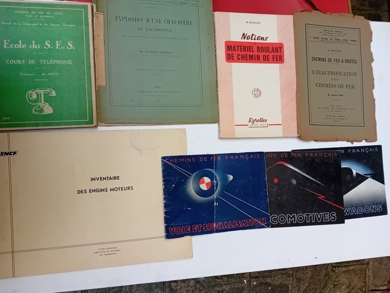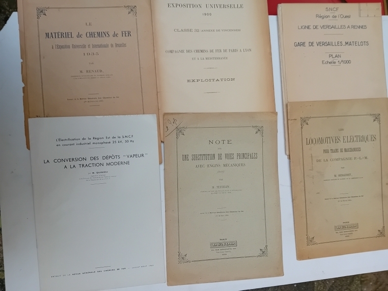 CHEMIN DE FER: BROCHURES, NOTICES, CATALOGUES TECHNIQUES: Nelson UHRY: L'électrification des chemins de fer, Igénieurs Civils, 1924. Inventaire des ENGINS MOTEURS, SNCF, 1970. M. BAILLEUL: Notions de matériel roulant de chemin de fer, Eyrolles, 1951. Robert DUBOIS: Explosion d'une chaudière de locomotive aux abords de la gare Saint-Lazare à Paris, 1905. Compagnie des chemins de fer de Paris à Lyon et à la Méditerranée, Exploitation, Exposition Universelle de 1900. M. RENAUD: Le matériel de chemin de fer à l'Exposition Universelle et Internationale de Bruxelles 1935. Ligne de VERSAILLES à RENNES, Gare de Versailles-Matelots, plan échelle 1/1000. SNCF Région Ouest, 1961. Louis SALOMON: Note sur l'emploi comparé des huiles de colza et des huiles minérales de Péchelbronn et du Caucase pour le graissage du matériel roulant, Dunod, 1885. M. TETTELIN: note sur une substitution de voies principales avec engins mécaniques (Suite), Dunod, 1931. R. LEVI et M. BOILLOT: Transformation et modernisation des aménagements de Trappes-Triage, Dunod, 1934. M. GASPARD: Le banc de compression de 900 tonnes de la S.N.C.F., Dunod, 1952. M. BERGERET: Les locomotives électriques pour trains de marchandises de la Compagnie P.-L.-M., Dunod, 1931. Instructions relatives au Dispatching-System. Ordre de service N° 34 (1937) de l'Exploitation. N° 1604 du Matériel et de la Traction. N° 3450 du Tableau Chronologique de la Voie. S.N.C.F. Région du SUD-EST, 1937. M.PETIT: COURS DE TELEPHONIE, Ecole du S.E.S. Service de la Télégraphie et des Signaux Electriques, Chemins de fer de l'Etat, 1930. CHEMINS DE FER FRANCAIS: locomotives, wagons, voie et signalisation, Imprimerie L. Danel, Lille.