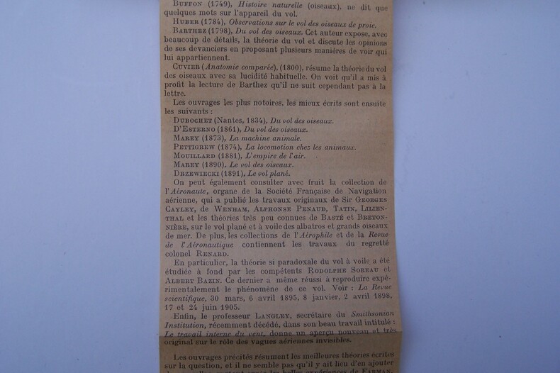 Pages 339 à 382: Calcul des forces mises en jeu dans le vol des oiseaux par M. Ch.-M. DE LABOURET. 17 Mai 1889, 9 figures et 2 planches in-t. Reliés en encart, deux dépliants imprimés: Le vol plané, étude bilbiographique par Edmond SEUX (1908) et le coefficient de la résistance de l'air par François PEYREY (1908).