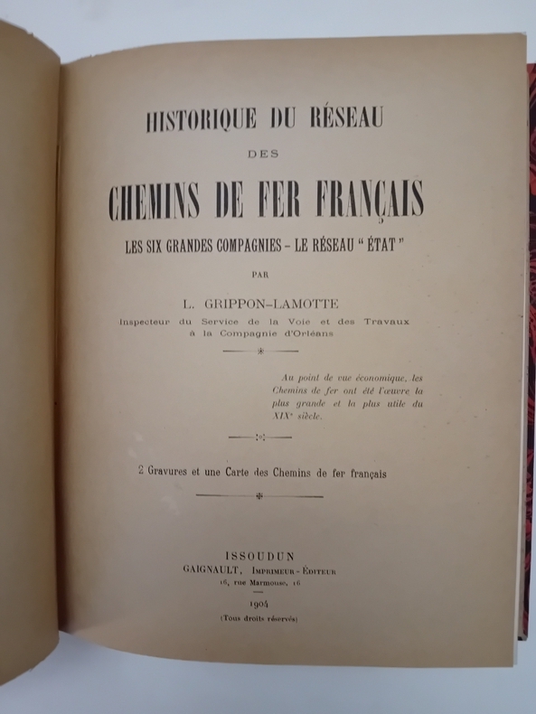Issoudun, Gaignault, 1904. Grand in-8, 543pp., 2 gravures et une carte ds chemins de fer français, demi-percaline moderne.