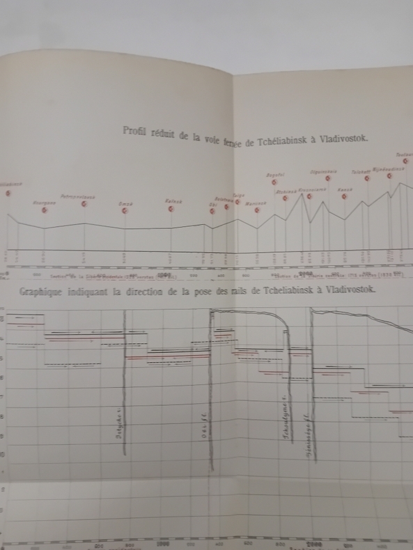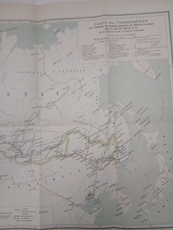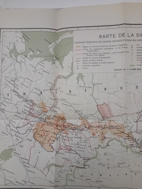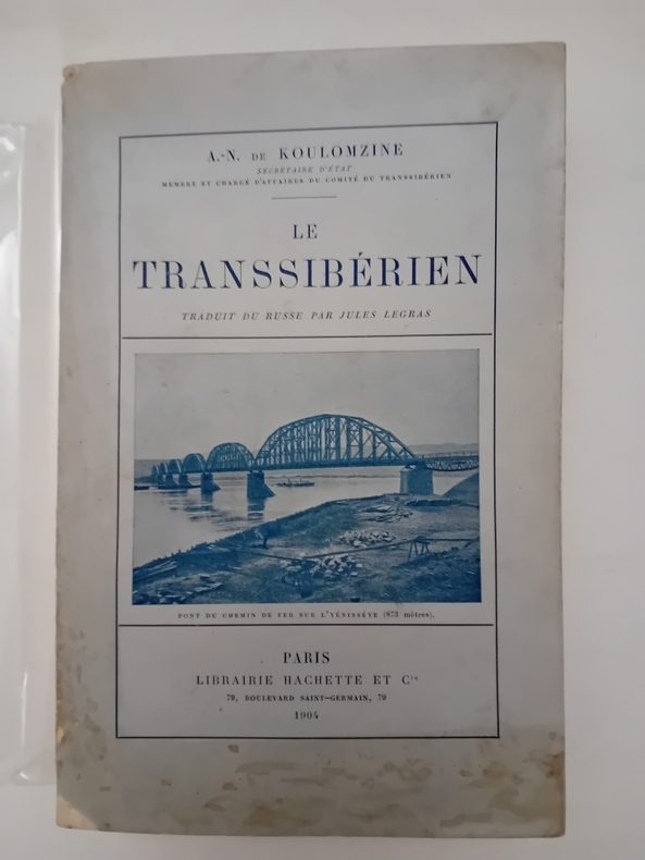 Ouvrage orné du portrait en frontispice de Sa Majesté Impériale Nicolas ALEXANDROVITCH (Empereur et Autocrate de toutes les Russies, Auguste Président du Comité du chemin de fer Transsibérien), de 32 reproductions, de 6 diagrammes et de 3 planches dépliantes en couleurs dont 2 grandes cartes. Paris, Librairie Hachette et Cie, 1904. Petit in-4 (25,5x3x17cm) broché, couverture rempliée, avec une vignette en couleur sur le plat supérieur, fentes au dos. VIII,326pp.