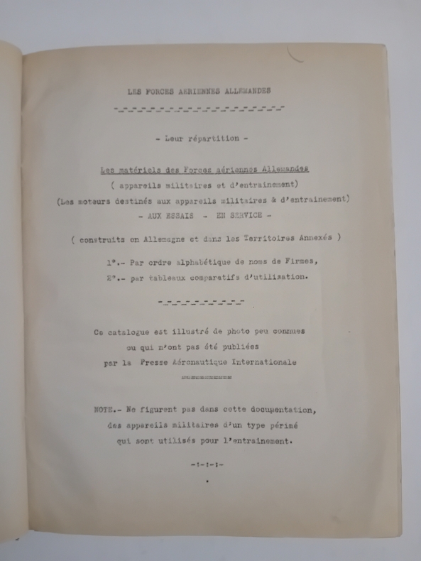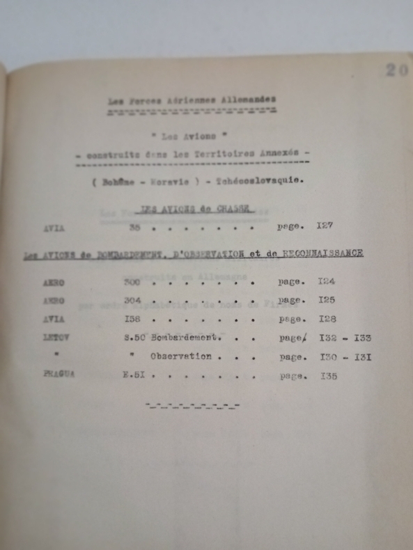 Album in-4 (21x27 cm.), 237 pages dactylographiées, carte dépliante (SHELL General Aeronautical Map of Germany, 1938), 15 photos, carte de la répartition des Forces Aériennes Allemandes au moment de l'occupation de la Tchécoslovaquie, cartonnage.