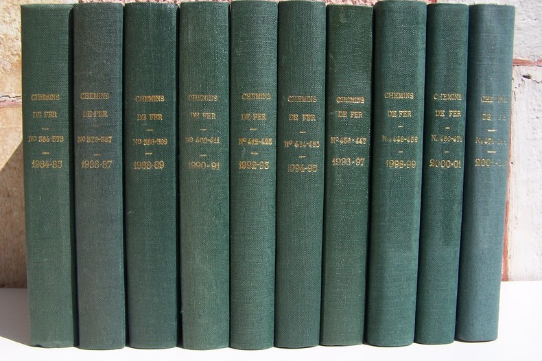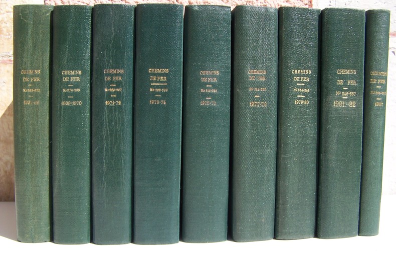 5 vol. in-4 br., couv. ill. couleurs, ill. noir et blanc, Revue (ex Bulletin ) de l'Association Française des Amis des Chemins de Fer - AFAC, Paris, 1973, env. 210 pp. au total. Au sommaire notamment : Le nouveau service voyageurs de la SNCF ; Cinquantenaire du courant continu 1500 V en France ; Les grands ouvrages réalisés ou projetés pour améliorer les liaisons ferroviaires internationales ; 1929-1973 du bulletin de l'A.F.A.C à Chemins de Fer, 300 numéros publiés ; Locomotives Série 18 quadricourant de la S.N.C.B. ; Après 15 Années d'Exploitation des T.E.E..
