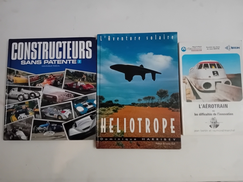 VEHICULES HORS SERIE: Jean BERTIN et Raymond MARCHAL: L'aérotrain ou les difficultés de l'innovation, 1989. Jacques BORGE et Nicolas VIASNOFF: Les véhicules hors série en 300 histoires et 150 photos, Balland, 1976. Dominique PASCAL: Constructeurs sans patente 2 et autres productions automobiles artisanales, L'Autodrome éditions, 2011. Patrick J. GYGER: Les voitures volantes, souvenirs d'un futur rêvé, avec la collaboration de Françis Valéry, Favre, 2005. Dominique HARRIBEY: Héliotrope, l'Aventure solaire, Préface de Lucien GIOL, ENSEEIHT, 1997.