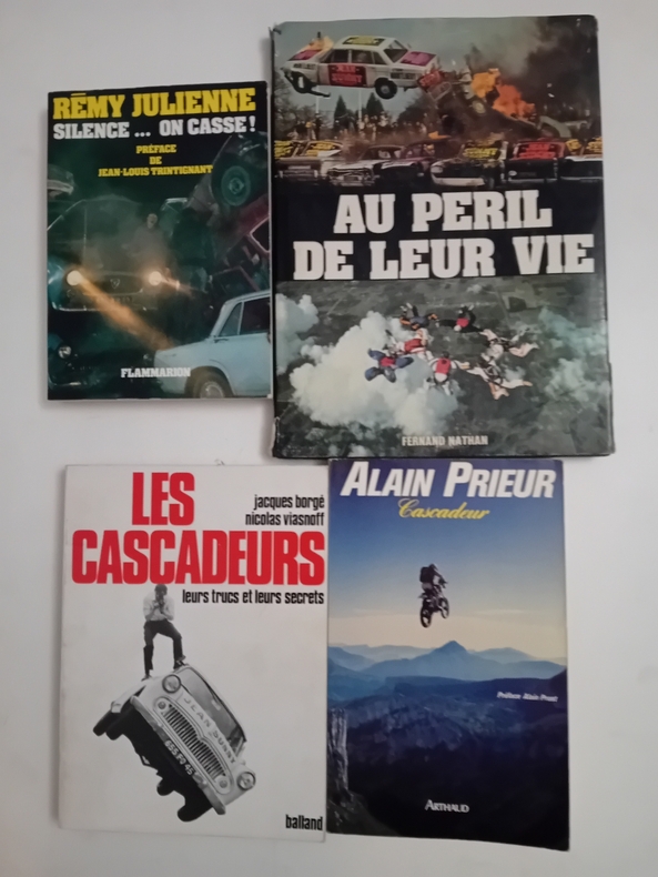 CASCADEURS, CASCADE: rémy JUKIENNE: Silence... on casse! Préface de Jean-Louis TRINTIGNANT, Flammarion, 1978. Alain PRIEUR Cascadeur, avec la collaboration de Bernard DUSSOL, Préface Alain PROST, Arthaud, 1989. Jacques BORGE et Nicolas VIASNOFF: Les cascadeurs, leurs trucs et leurs secrets, Balland, 1979. Au péril de leur vie, traduit et adapté de l'anglais par Anne LAFLAQUIERE et André MICHEL, Nathan, 1981.