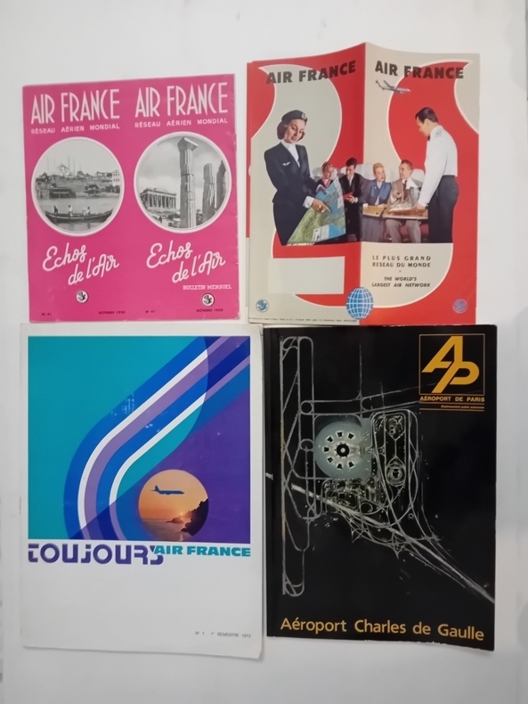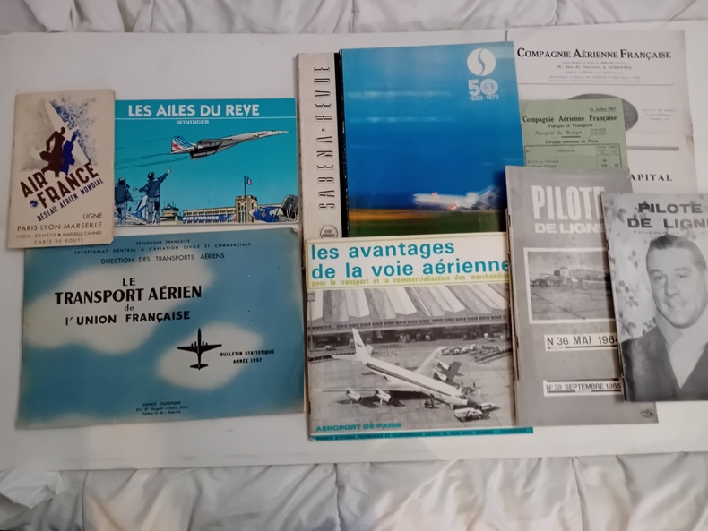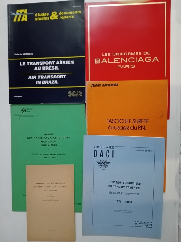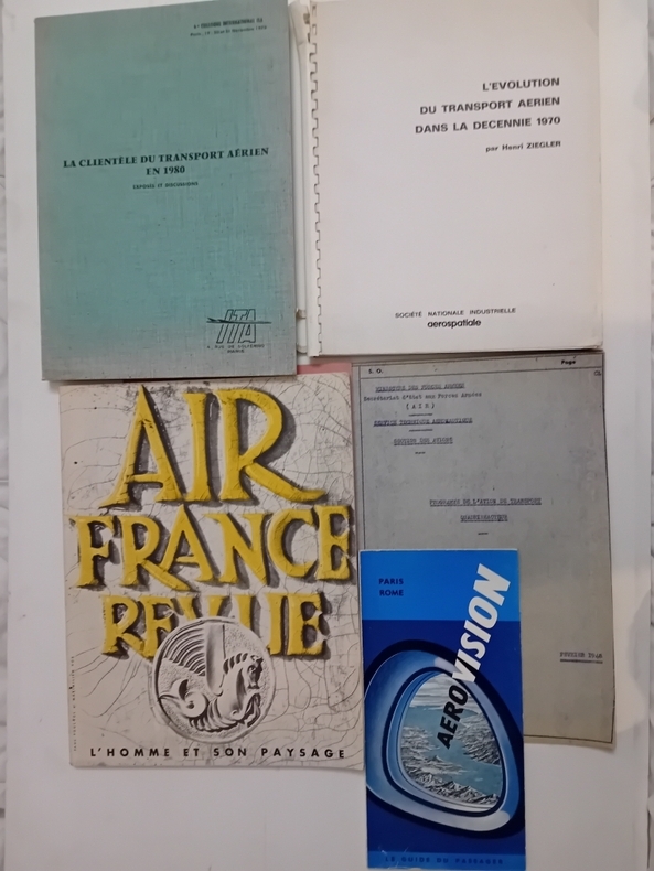 1987. AIR FRANCE Toujours N° 1 du 1er semestre 1973. Le transport aérien de l'Union Française, bulletin statistique 1957. Les avantages de la voie aérienne pour le transport et la commercialisation des marchandises, Aéroport de Paris, Avril 1968. Compagnie Aérienne Française: augmentation de capital, Février 1923. Circuits environs de Paris, 1927. SABENA REVUE Printemps 1949, N° 1 1923-1973. PILOTE DE LIGNE N° 25 Février 1961, 36 Mai 1964, 38 Septembre 1965. Aéroport Charles de Gaulle, Aéroport de Paris, illustrations de Paul LENGELLE, 1974. AIR FRANCE REVUE N° 12 Premier trimestre 53. Programme de l'avion de transport quadrireacteur, S.T.A., Février 1948. René LEMAIRE: Remarques sur les conditions du trafic aérien Transatlantique vers 1960-1962. Henri ZIEGELER: L'évolution du transport aérien dans la décennie 1970, Société Nationale Industrielle Aérospatiale, Mai-Juin 1971. La clientèle du transport aérien en 1980 Exposés et discussions, ITA, Novembre 1975. Situation économique du transport aérien, résultats et perspectives, 1978-2000, OACI, 1989. Trafic des principaux aéroports mondiaux 1966 à 1970, Aéroport de Paris, Octobre 1971. Fascicule sureté à l'usage du P.N. Mars 1980. AEROVISION Le guide du passager PARIS ROME 1960. Olivier DE MAROLLES: Le transport aérien au Brésil, ITA, 1996.
