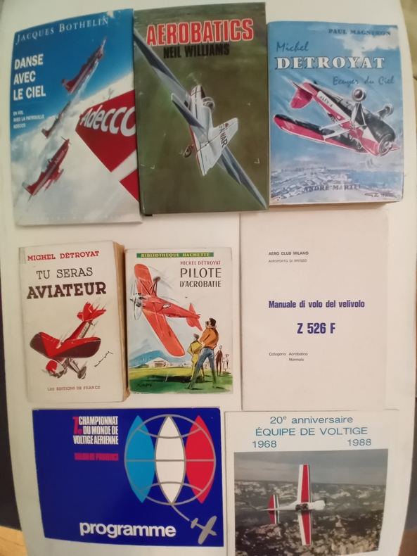 VOLTIGE, ACROBATIE AERIENNE: Michel DETROYAT: Pilote d'acrobatie, Hachette, 1957. Tu seras aviateur, Les Editions de France, 1938. Paul MAGNERON: Michel Détroyat Ecuyer du Ciel, André Martel, 1957. Jacques BOTHELIN: Danse avec lke ciel, en vo; avec la Patrouille Adecco, Le Cherche Midi, 1997. Neil WILLIAMS: Aerobatics, St. Martin's Press, 1979. Manuale di volo del velivolo Z 526 F. 20e anniversaire de l'Equipe de Voltide de l'Armée de l'Air EVAA 1968-1988. Programme du 7e Championnat du monde de voltige aérienne, Salon de Provence. Championnats de France de voltige aérienne, LE MANS, Du 6 au 9 Septembre 1979. Paul O'NEIL: Les fous volants, Time Life, 1981.