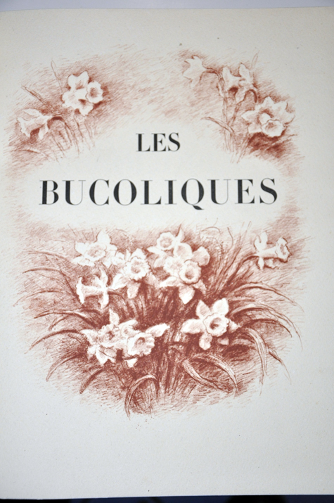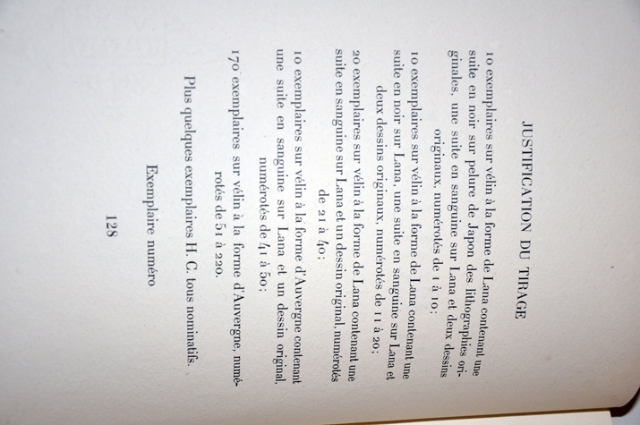 Lithographies originales de René Demeurisse. Texte latin et traduction nouvelle de Henry Charpentier.P, Éd. Galatea 1946, Grd. in-4 ( 33,5 x 26 cm) de (8) 135 (5) pp. Impression bicolore rouge et noire. Toutes les pages de la partie texte en latin (p. 1 à 79) sont lithographiées soit à pleine page, soit en accompagnement du texte, certaines ill. sur les deux pages. En-têtes et culs de lampe Pour la traduction : vignette de titre, 11 en-têtes, 10 culs de lampe et 2 "à pleine page". Plein vélin à la Bradel doublé, titre doré; couv. entiérement cons., dont le plat sup. porte une litho tirée en sanguine. Tirage à 220 ex., un des 180 sur papier vélin à la forme d'Auvergne. belle réalisation.
