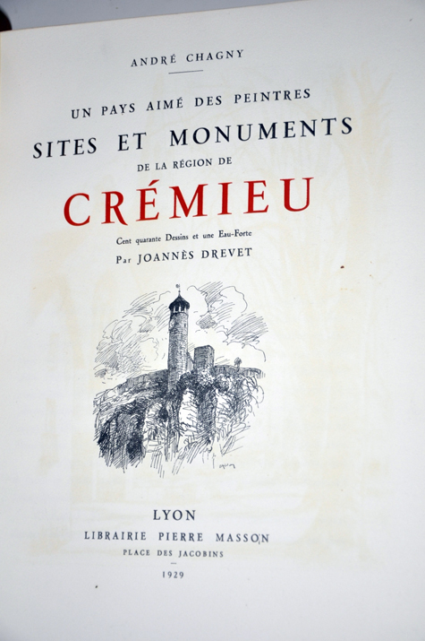 Librairie Pierre Masson, Lyon, 1929, Fort volume In4, Br, couverture rempliée, 214pp. Bel exemplaire, couverture et papier bien conservés. Illustré de 140 dessins et une au forte de Joannès Drevet. Tiré à 662 exemplaires numérotés, no 217, relié dans une superbe realisation non signée , plein maroquin fauve avec filets dorés sur les plats ,tranche superieure dorée , dos decoré d'une vue de Cremieu tres beau travail , photos sur demande