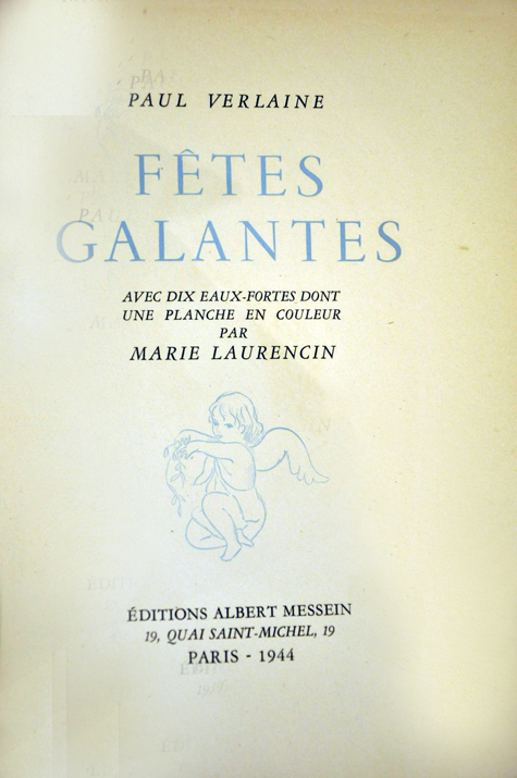 1944 Albert Messein, Paris, 1944. . Ouvrage illustré par Marie Laurencin, edition publiée pour le centenaire du poète. 10 EAUX-FORTES originales de Marie LAURENCIN, avec le frontispice (en couleurs) + 9 hors-texte, elles sont signées dans la plaque des initiales ML, la couverture en bleu de l'ouvrage et la vignette de titre sont de Marie Laurencin egalement . Tirage à 248 exemplaires numérotés sur pur fil Lana. Reliure demi maroquin bleu nuit à coins dos à 4 gros nerfs, titre et auteur dorés, tranche superieure dorée .