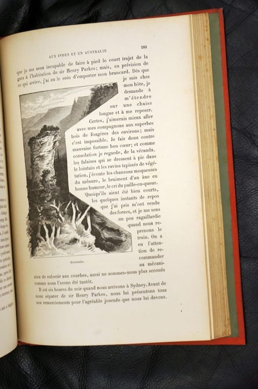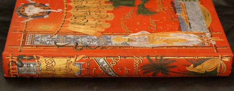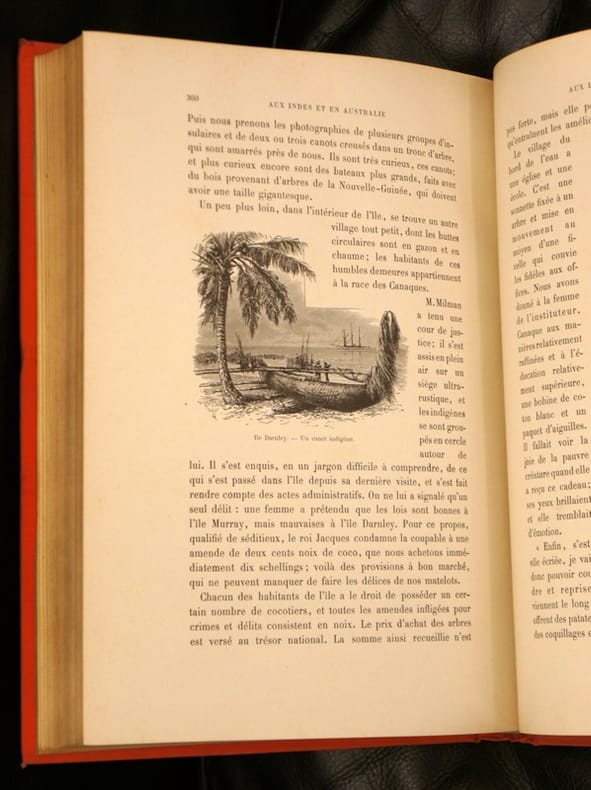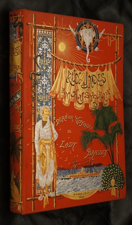 2 textes en 1 fort volume in-4, publiés par Mame et Fils à Tours, reliés en demi-chagrin violine de l' époque, dos à nerfs, filet doré sur les nerfs, larges compartiments de grands fleurons dorés, titre doré ( Brassey Voyage aux Indes et en Australie), plats de toile chagrinée violine avec encadrement à froid, tranches dorées. Reliure très légèrement frottée; quelques piqûres, mais bon exemplaire.