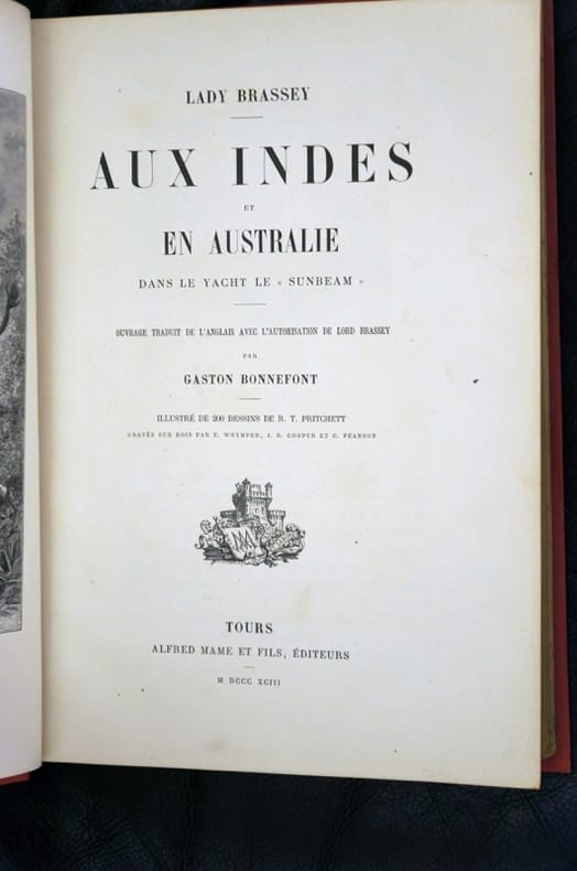 AUX INDES ET EN AUSTRALIE...de Lady Brassey.Tours, 1893 ; 398pp. Illustré de 200 dessins de E.T. Pritchett, gravés sur bois par Whymper, Cooper et Pearson, dans le texte ou à pleine page.Suivi de : LE REGNE DE L' ELECTRICITÉ par Bonnefont. TOURS, 1895; 381pp. Illustré de 250 gravures. L'auteur indique qu'il a emprunté de nombreux textes à Dary :" Tout par l'Electricité". Réunion en un seul volume, par un amateur, de deux ouvrages dus à Bonnefont et parus chez Mame. (Reu-CO2)