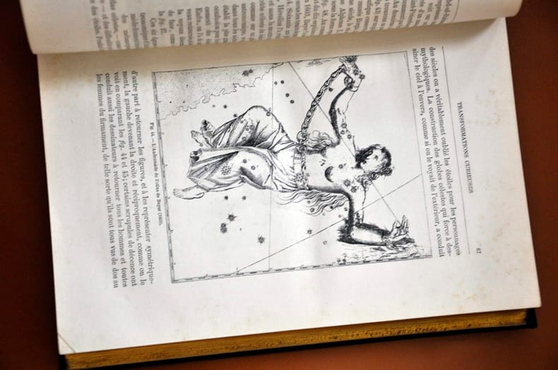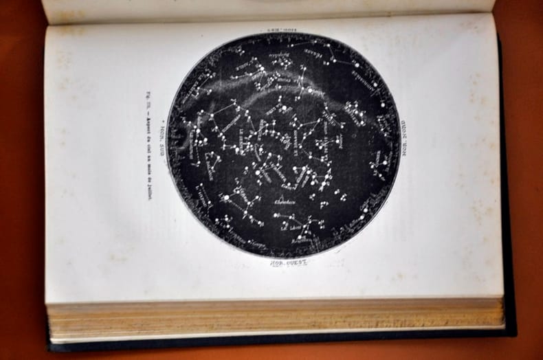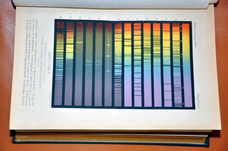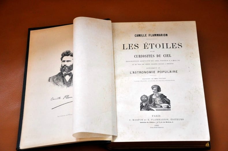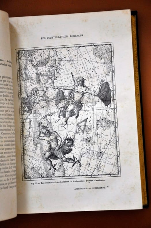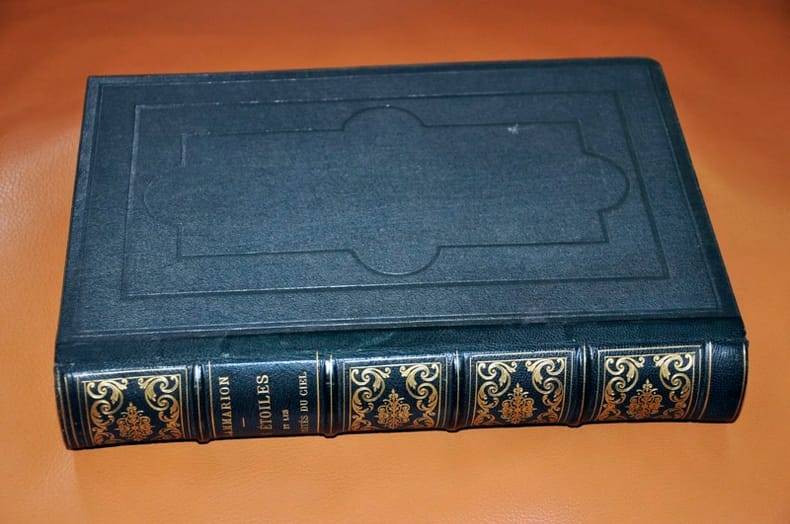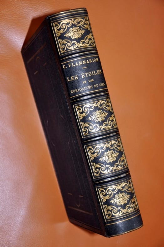 Description complète du ciel visible à l’oeil nu et de tous les objets célestes faciles à observer. Supplément de l(astronomie populaire. In 8 demi cuir, titre et filets dorés. Faux-titre, portrait de l’auteur sous serpente, en frontispice, titre avec vignette, VII, 792 pages, 400 gravures, cartes célestes, planches en chromolithographie. Paris C. MARPON et E. FLAMMARION éditeurs, 1882. Rousseurs. Plus concentrées en début et fin de volume.