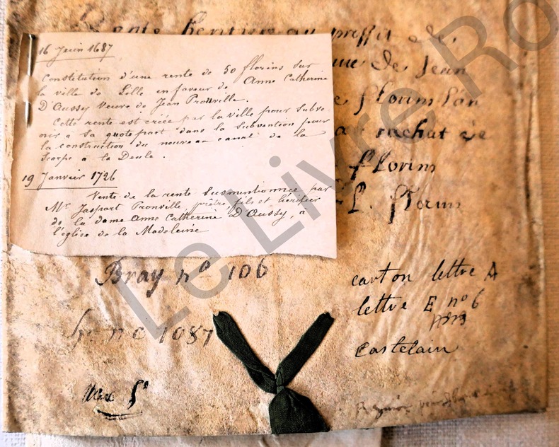 arrière du document tacheté. Résumé en papier accroché par une épingle - LILLE - CANAL - DEULE - SCARPE - NORD - VIEUX PAPIER