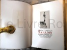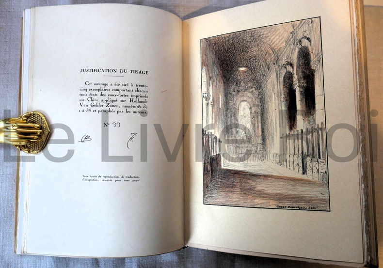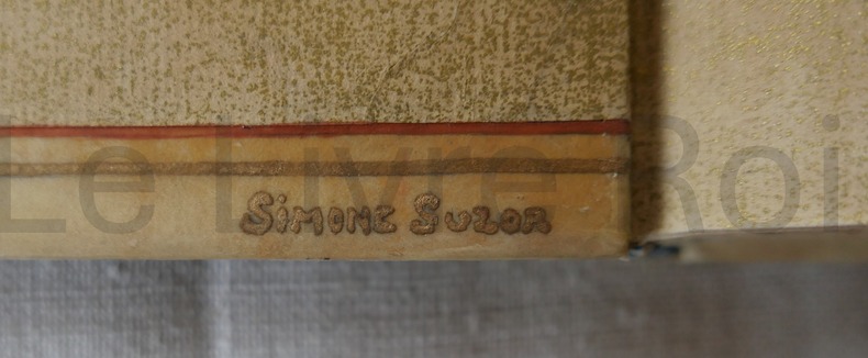 in4 reliure plein parchemin à motifs médiévaux rouge et or signée Simone Suzor, sous étui recouvert de papier mordoré - Un des 35 exemplaires (ici le 33), édition originale. 11 eaux-fortes en triple état, noir, bistre et eaux-forte appliquées sur chine, signées par l'artiste. 4 dessins en double en noir et en sanguine sur papier japon. 2 dessins originaux rehaussés de lavis