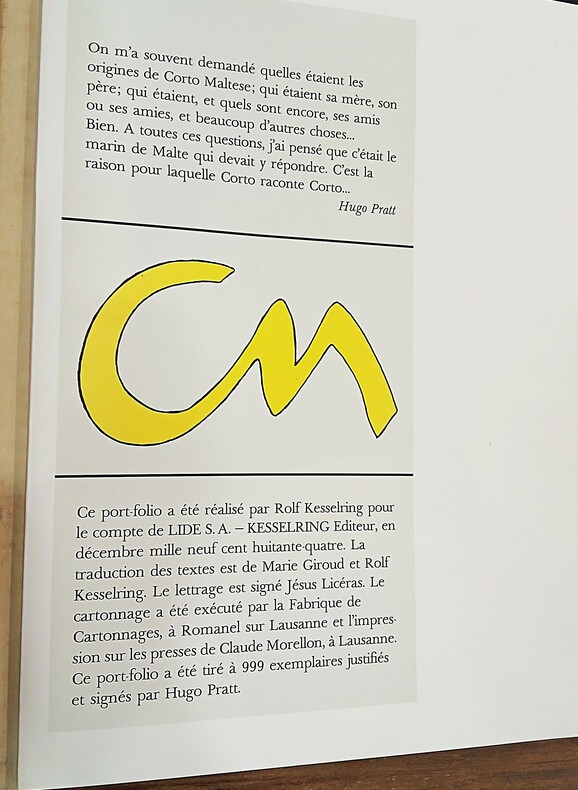Élégant port-folio cartonné (370x300mm) bleu nuit, demi toilé blanc, à rabats avec une vignette en couleurs collée sur le plat supérieur. Recueil bien complet de 14 planches en couleurs, numéroté (36/999) et signé par Hugo Pratt. Lettrage signé Jésus Licéras. Corto Maltèse raconte sa propre vie, celle de son père, celle de sa mère. La vie de ses ami-e-s aussi. La traduction des textes est de Marie Giroud et Rolf Kesselring. ''Mon père était originaire de Cornouailles. Plus exactement d'une petite ville nommée Tintagel King's Arthur Castel.. Un lieu plein de fées, de mages et de sorcières.. Il racontait qu'il était..'' Exemplaire en très bon état, lég. marque de pliure au bas de la couv. intérieure.