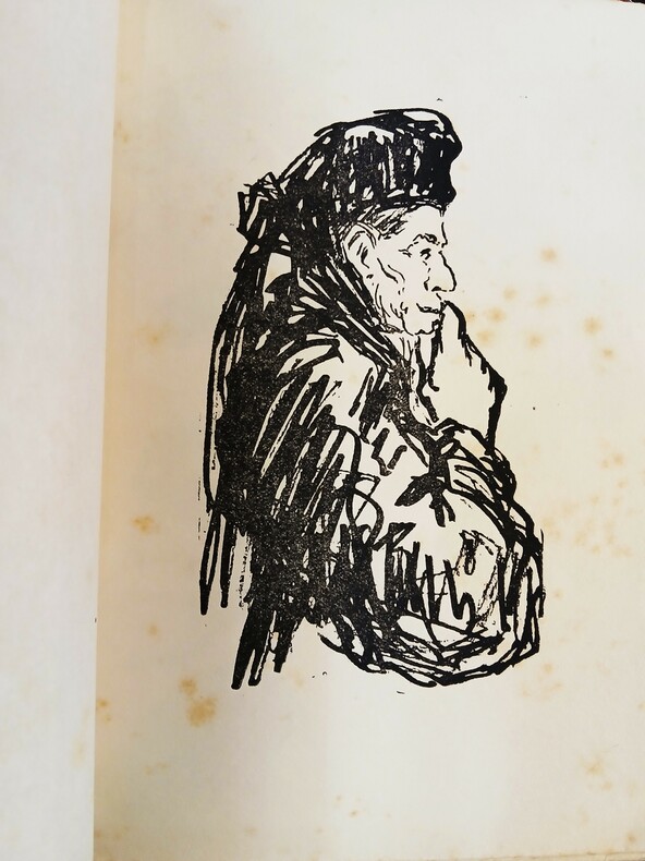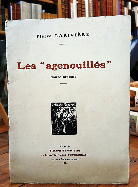 Édition originale brochée, plaquette in-8 agrafée (195x140mm) de 8 feuillets non paginés, titre en noir et rouge sur le plat supérieur avec une vignette gravée. Série de 12 croquis de l'artiste Pierre Larivière (1883-1932) sous serpentes. Tirage numéroté (194/325), celui-ci un des 300 exemplaires sur papier alfa bouffant. Sympathisant des causes pacifistes, il publia des poèmes dans le journal de Sébastien Faure CQFD et des croquis pour la revue Les Humbles de Maurice Wullens. La ghilde des forgerons est "un groupement de jeunes qui voient en l'art un puissant facteur d'émancipation humaine, qui conçoivent une action coordonnant toutes les manifestations de la pensée (littéraire, artistique, philosophique, sociale..". Des rousseurs, bon état.