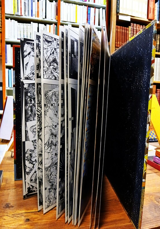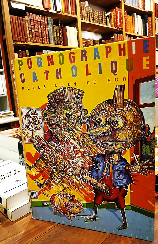 DOURY Pascal, Pornographie catholique. A Paris, Éditions Le Dernier Terrain Vague, 1982. Cartonnage éditeur (340x250mm) à couverture imprimée en couleurs, 21 feuillets non paginés dont 1f de texte in fine. Graphzine de la série Elles Sont De Sortie (ESDS). Série graphique de près de 300 publications créée en 1977 par deux artistes à la fois esthètes et provocateurs, Bruno Richard (dessinateur et graphiste, né en 1956) et Pascal Doury (illustrateur, éditeur de poésie, 1956-2001). Ce dernier, figure centrale de l'expérimentation graphique et éditoriale, en devient le seul animateur dès 1994. Créées en 1977 par Éric Losfeld (1922-1979) les Éditions Le Dernier Terrain Vague s'avère un mélange de genres à la fois cocasse et provocateur. Rousseurs éparses sur les couvertures, intérieur en très bon état.