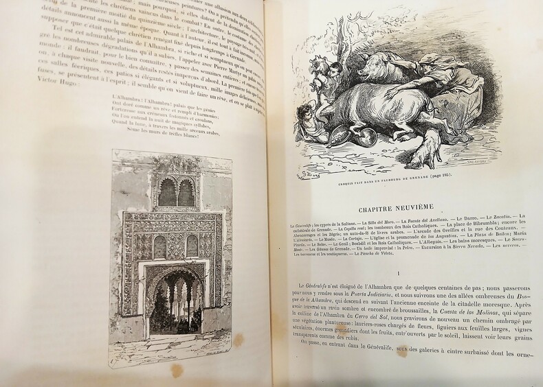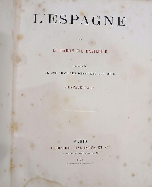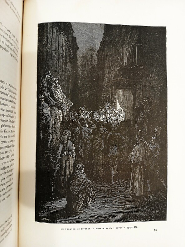 In-folio relié (350x260mm), chagriné bleu, titre doré au dos, plaque de Souze, décor doré au dos et sur les plats, toutes tranches dorées. 799 pages. Tables in fine. Jean-Charles Davillier (1823-1883) fut sans doute l'un des premiers érudits français à s'intéresser à l'art espagnol, notamment à la sculpture sur bois et aux arts décoratifs. Si Davillier est un familier, dès les années 1850 des différentes contrées hispaniques, ce n'est qu'en 1862 en compagnie de Gustave Doré (1832-1883) qu'il décide un nouveau voyage afin de réaliser un inventaire des monuments et coutumes. Le voyage débute par les cités de la côte méditerranéenne (Figueras, Gerona, Barcelone), son inlassable curiosité l'emmène dans les faubourgs madrilaines jusqu'à la pointe de la péninsule ibérique Malaga, Grenade, Cordoue s'attachant aux danses (los Panaderos, la Jota), à la tauromachie, aux détails architecturaux des mosquées (de Cordoue) et des aqueducs (Mérida) enfin aux ''petits métiers''. Coins élimés, auréole en bas de page (120 premiers feuillets), des rousseurs (premiers et derniers feuillets).
