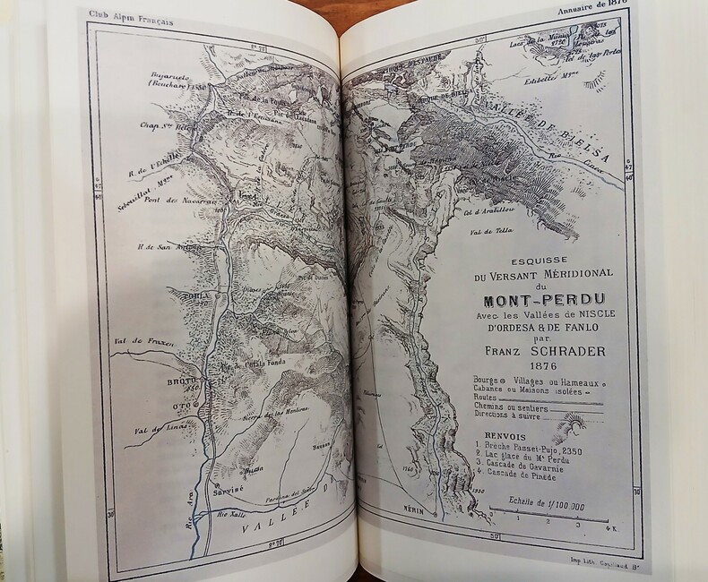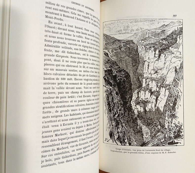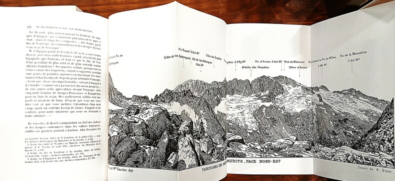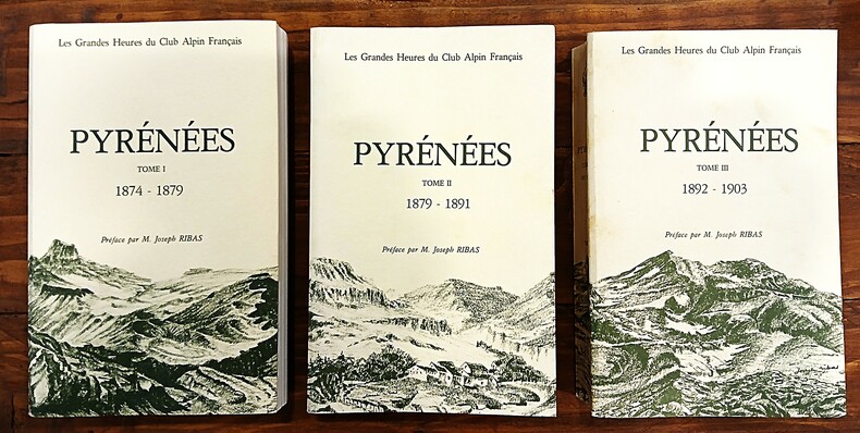 RIBAS Joseph (collectif), Pyrénées (3vol). A Villeneuve-Loubet, Éditions Sirius, 1983. Bel ensemble complet de 3 volumes brochés (220x140mm), couvertures à rabats imprimés. vol1:(xiii),802pages, vol2:(xv),736pages, vol3:(x),747pages. Collection Les Grandes Heures du C.A.F. publiée sous l'agrément et sous le patronage du Club Alpin Français. Tirage numéroté (371/500) avec une préface de Joseph Ribas. Récits de courses, d'ascensions, d'excursions, parfois d'explorations menées par les plus grands et audacieux pyrénéistes, rédigés pour la plupart d'entre eux à la première personne de manière chronologique de 1874 à 1903. De nombreuses gravures, cartes et photographies en noir accompagnent utilement le texte. Écrits de Louis Ramond de Carbonnières, Paul Édouard Wallon, Henry Russell, Franz Schrader, Charles Packe, Mauvif de Montergon, Aymar de Saint-Saud, Roger de Bouillé, Fontan de Négrin et bien d'autres pyrénéistes aguerris. Texte d'Émile Belloc sur les sources de la Garonne (vol3). ''Il me semblait sentir la nuit et entendre le silence, et la présence palpable de Dieu me frappait d'une espèce de stupeur. Je le voyais partout. Dans les étoiles qui avaient l'air de palpiter, dans les nuages assoupis sous mes pieds, interceptant tous les bruits de la terre ; dans les glaciers, la neige et les rochers, formant ensemble de grandes masses effroyables et confuses ; dans l'espèce d'effarement qui régnait sur le monde.. dans tout cela et partout, je croyais voir un univers surnaturel, où j'étais seul en face de Dieu, et sur les ruines de la nature.'' (H. Russell, TII). Volume 1 surligné au crayon, volumes 2 et 3 intacts, ensemble en bon état.