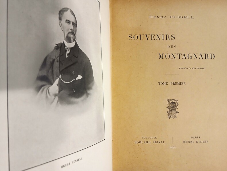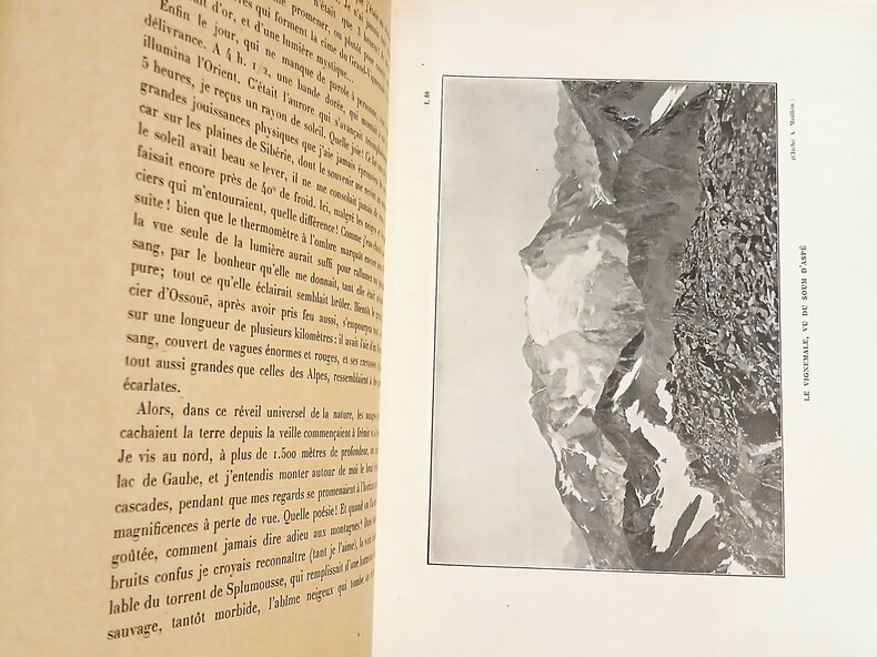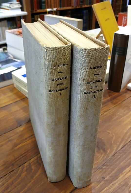 Ensemble complet de 2 volumes reliés (240x185mm), pleine percaline blanc cassé, vol1:(viii),394pp; vol2:390pp. Nouvelle édition avec en frontispice la photographie en noir de Henry Russell. Accompagné de 18 planches photographiques en noir ht. La première édition, parue en 1878 (à Pau, in-12, Imprimerie Vignancour) rassemble les récits (de manière chronologique) des différentes excursions déjà publiés dans différentes revues (Bulletin de la Société Ramond, Annuaire du Club Alpin). En 1887 paraît une deuxième édition (in-8, 508pp) avec un texte remanié. Les récits des excursions y sont classés par pics depuis la Rhune jusqu'au Canigou. Peu de temps avant sa mort (le 5 janvier 1909) Henry Russell publie une seconde édition revue et corrigée (vol in-8, 738pp) à Pau chez Vignancour. Y sont séparées les Pyrénées françaises de la chaîne espagnole. Dans la dernière partie sont regroupés foule d'articles sur 3 courses dans les Alpes, les nuages, la musique, la philosophie.. ''Ceux qui n'ont pas gravi les hautes montagnes en plein hiver, ne peuvent avoir la moindre idée de l'éblouissement que l'on y éprouve, et de l'intensité quasi-surnaturelle de la lumière sur ces déserts plus blancs que l'albâtre, et plus brillants que le coeur embrasé de l'Afrique''. Feuillets jaunis, couvertures piquées, bon exemplaire.