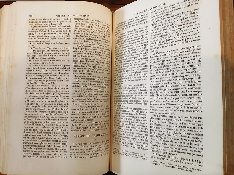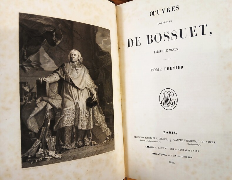 Ensemble complet en 12 volumes in-8 (270x180mm) reliés à la bradel demi-chagrin vert émeraude, titres dorés au dos. Texte en latin et en français sur 2 ou 4 colonnes. Tome1, Écriture Sainte:(xvi),770pp;tome2-Écriture Sainte- Piété:772pp;tome3-Sermons:678pp;tome4-Sermons:683pp;tome5-Éducation:682pp;tome6-Éducation-Administration:736pp;tome7-Controverse:809pp;tome8-Controverse:778pp;tome9-Controverse-Sur le quiétisme:763pp;tome10-Controverse,Correspondance:782pp;tome11-Correspondance:799pages;tome12-Correspondance:371pp,417pp. Portrait de Bossuet en frontispice dessiné par Rigaud et gravé par Pigeot. Cette édition fait suite à celle de Jean-Baptiste Abrizzi en 10 vol. (1736-1757), puis celle de Calabre Pérau (12vol) en 1743-1747 et de Le Roi, toutes deux ''dignes d'être recherchées et épuisées -Le Roi-''. Publiée en 12 volumes, cette parution fut exécutée à partir des manuscrits originaux et publications les plus correctes, elle contient les écrits de Bossuet sur l'Écriture sainte et son interprétation; les livres de piété, discours, sermons, oraisons funèbres; pour l'éducation du grand Dauphin; pour l'usage, la discipline, l'instruction de son diocèse; les ouvrages de controverse et de critique; enfin différents opuscules et choix de lettres. Bords frottés, des rousseurs, ensemble en bon état.