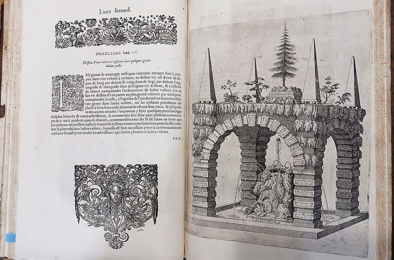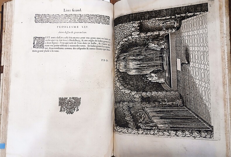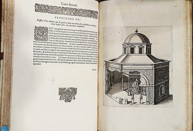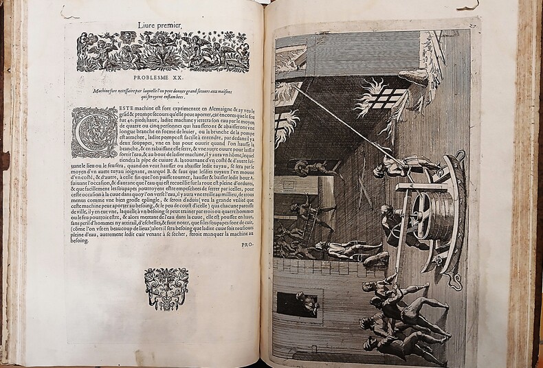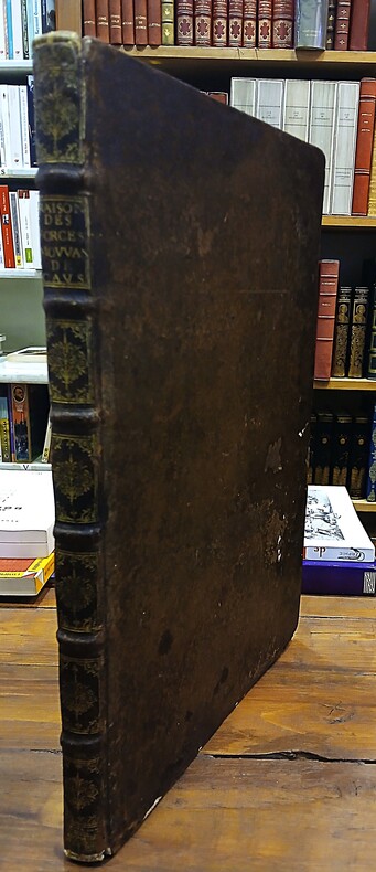 In folio (390x270mm) relié pleine basane brune mouchetée, dos à 6 nerfs avec titre doré et caissons ornés, liseré sur les coupes, tranches mouchetées. 3 parties en 1 volume : 1fbnc;Livre 1 (1624): 1f titre, (3ff), 46ff; Livre 2 (1624) : 1f titre,1f, 28ff; Livre3 -sd: 19pages, 3pages de tables, 1f gravure dépliante représentant le système du diapason servant à la mesure des tuyaux d'orgues, 2fbnc. Bandeaux, culs de lampes et lettrines gravées. Ex-libris manuscrits à l'encre noire, un sur le contreplat, l'autre marginal sur le feuillet de titre. Exemplaire qui rassemble 3 livres, très richement illustré, Livre 1 : 20 dessins et gravures in-texte, 35 gravures hors-texte dont une double planche (problème 30: mesures du madrigal); Livre 2: 28 gravures hors-texte; Livre 3 : 6 dessins et gravures in-texte et 3 gravures hors-texte, avec le feuillet dépliant in fine. Gravures de Jacob van Heyden (1573- 1645) réputé pour ses portraits gravés sur cuivre et de Peter Iselberg (1568-1630), auteur des gravures du célèbre ouvrage d'emblèmes Emblemata politica (1617) . Après la définition des 4 éléments (eau, terre, air, feu) ainsi que l'énoncé des 18 théorèmes , l'ingénieur et architecte français Salomon de Caus (1576-1626) inventorie dans le Livre premier les plus surprenantes et les plus extraordinaires des machines: celle ''pour faire une horloge avec le cours d'une fontaine''. Le livre II qui suit s'intéresse plus particulièrement aux grottes et fontaines pour l'ornement des Palais, Maisons de plaisance et Jardins, s'y succèdent dessins de volières à oiseaux, dessins de montagnes, et notamment le dessin de la grotte Tmollus en référence au récit de Midas par Ovide. Précurseur de la machine à vapeur et inventeur de machines extraordinaires pour les demeures royales d'Angleterre et d'Allemagne, Salomon de Caus (1576-1626) fut tout imprégné de culture encyclopédique à savoir la mécanique, la musique, les langues anciennes, la perspective et l'architecture. Malgré cela, il est demeuré à peu près inconnu jusqu'à nos jours. Afin de perfectionner ses connaissances il voyagea en Italie, en Belgique (y travaillant comme ingénieur pour l'Archiduc Albert), en Angleterre (au service du Prince de Galles), en Allemagne (pour Frédéric V), et là, à Heidelberg, il prit en charge la construction de nouveaux bâtiments, volières, jardins, portiques et fontaines jaillissantes. A ce point que les jardins du Palais d'Heidelberg furent considérés comme la huitième merveille du monde.. jusqu'à son pillage. L'édition originale paraît en 1615 chez Jan Norten à Francfort. En l'année 1624, Salomon de Caus dessine pour le cardinal de Richelieu une carte de l'Italie et lui dédie La pratique et démonstration des horloges solaires édité chez Jérôme Drouart. Deux imprimeurs parisiens Jérôme Drouart et Charles Sevestre se chargent en 1624 de la nouvelle édition des Raisons des Forces mouvantes. Suite à l'édition princeps de 1615, plusieurs modifications quant au texte ont été apportées, l'orthographe révisée et le frontispice remanié. A la fin du Livre III, Livre qui n'est pas annoncé dans l'édition de 1615, Salomon de Caus espère '' faire encore un autre livre, où seront montrées des machines fort rares, & que je tiens fort secrètes, et entre les autres, une qui représentera une Musique plus parfaite qu'aucune humaine créature ne peut faire''. Dans cette édition de 1624 apparaissent 10 nouvelles planches dont certaines extraites du Hortus Palatinus (recueil de gravures publié en 1620). (cf Hélène Vérin, CNRS, 2009). Des manques au niveau des coiffes et des plats, auréoles sur les premiers feuillets, déchirure marginale (p28, Livre II), galeries de vers marginales livre I.