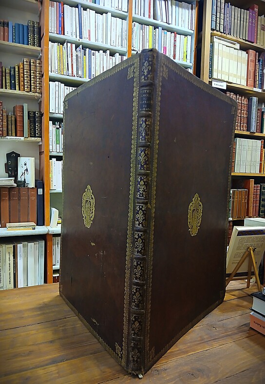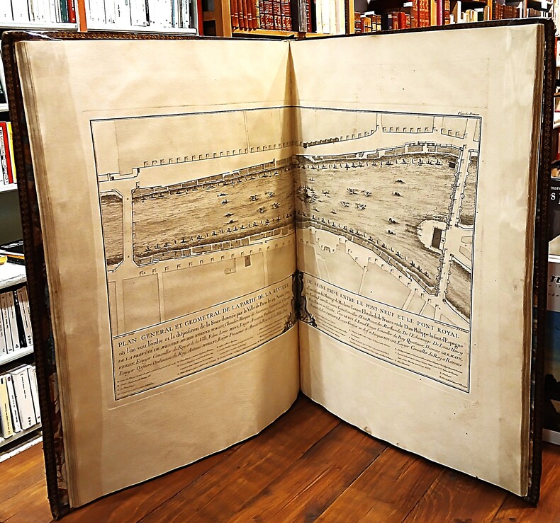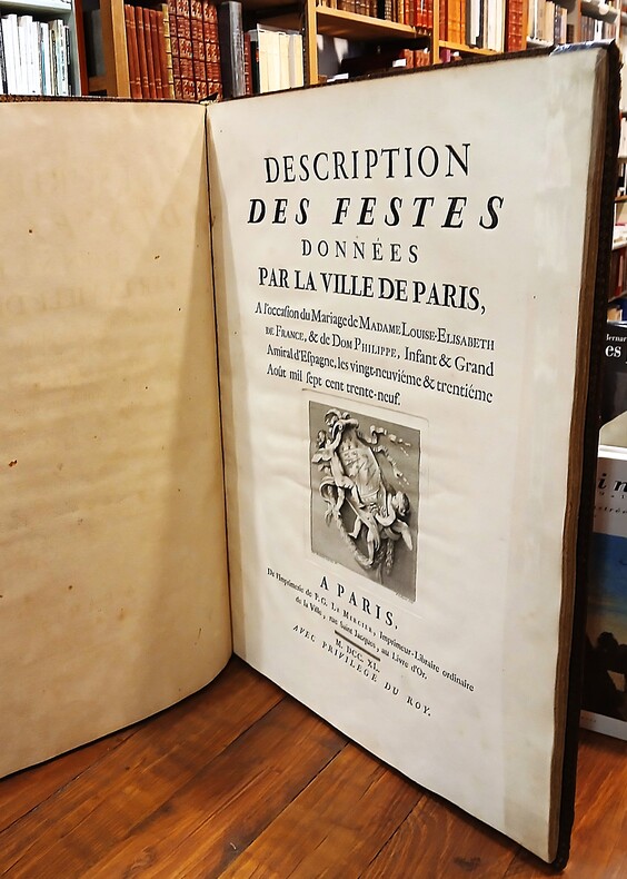 In-folio plein maroquin (640x480mm) de couleur brun-rouge, dos à 10 nerfs avec pièce de titre dorée et caissons ornés d'une fleur de lys, dentelle dorée accompagnée d'un triple encadrement doré sur les plats avec écoinçons à chaque extrémités et au centre le blason de la Ville de Paris. 1fbnc, 1f titre avec 1 vignette dessinée par E. Bouchardon gravée par Soubeyran représentant 2 angelots ceignant le blason de la ville de Paris, 22 pages (2 parties), 13 plans gravés dont 8 double planches. Page 1, bandeau de J. Rigaud représentant la joute sur la Seine. Certainement un des plus beaux ouvrages sur ce thème. Le texte dans sa première partie (p1 à 16) décrit les fêtes données par la Ville de Paris à l'occasion du mariage de la fille de Louis XV et de Marie Leszczynska, Louise Élisabeth de France (1727-1759) avec l'Infant d'Espagne Don Philippe (1720-1765) (fils de Philippe V d'Espagne) le 29 août 1739 à Paris. La deuxième partie du texte (page 16 à 22) décrit en détail le déroulé du Bal donné à l'Hôtel de Ville la nuit du 31 août 1739. Les plans, dessinés et gravés par J.F. Blondel sont inventés par Salley. Le Chevalier Servandony, Gabriel : premier Architecte du Roy et Rousset en ont aussi dessiné les gravures. La fête se déroule entre le Pont-Neuf et le Pont Royal sur une étendue de 450 toises (soit 263 mètres). Un salon destiné à la musique (planche III, dessinée par Servandoni) et servi par 180 musiciens, conduits par Rebel et Francoeur accompagne le mariage, tandis qu'un Temple à la grecque construit sur le Pont Neuf laisse jaillir d'innombrables feux d'artifice -plus de 6000 fusées constituant la Petite et la Grande Girande -. Des monstres marins prêts à combattre parent la Seine (planche I). La double planche XII dessinée et gravée par Blondel, imaginée par Salley représente une coupe de l'Hôtel de Ville vu en perspective sur sa largeur où sont dessinés les décorations et illuminations de la Cour. La double planche V dessine une vue générale du Pont Royal au Pont Neuf configurant les bords de Seine avec ses décorations, illuminations et feux d'artifice. La beauté des illustrations n'est pas sans rappeler le talent d'un Jean-Nicolas Servandoni (1695-1766) qui, peintre et décorateur de théâtre a non seulement participé à la reconstruction de Lisbonne suite au tremblement de terre, mais, acclamé comme il le fut par Diderot pour ses décors de l'Opéra Orion, Servandoni a su donner un vrai souffle nouveau aux représentations d'architecture et de monuments en ruine. Il en est de même pour Jacques-François Blondel (1705-1774), architecte et théoricien de l'architecture française, qui eut pour élève Nicolas Ledoux et fut un des rédacteurs de l'Encyclopédie Diderot et d'Alembert. Exemplaire avec coiffes et coins élimés, plats avec manques, auréole marginale p18, déchirures sans manque sur qques cm plans III, VIII, IX.