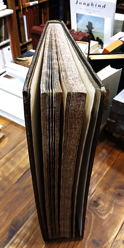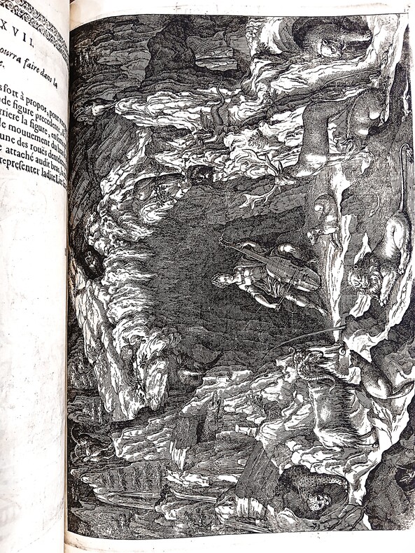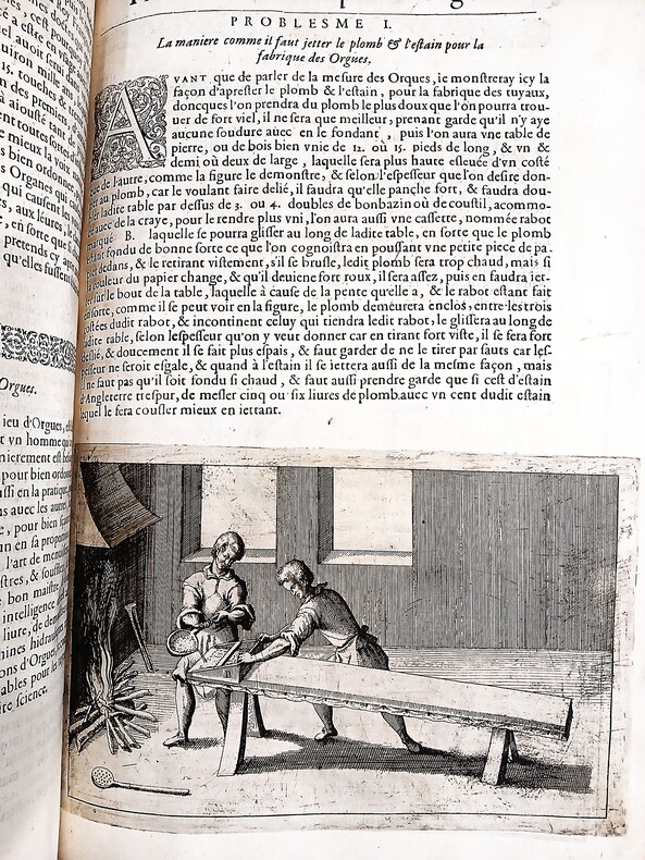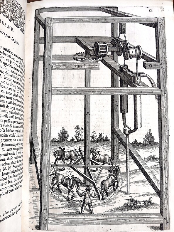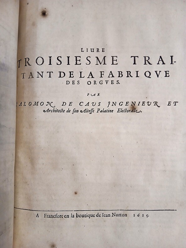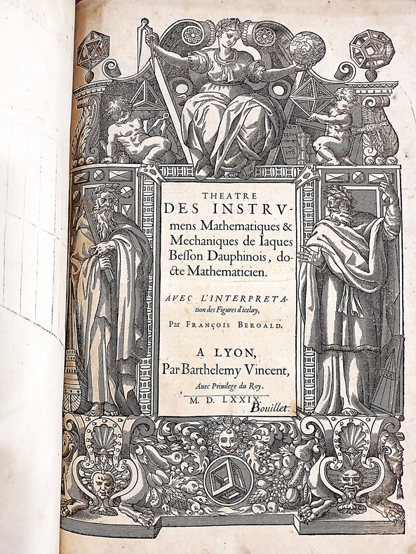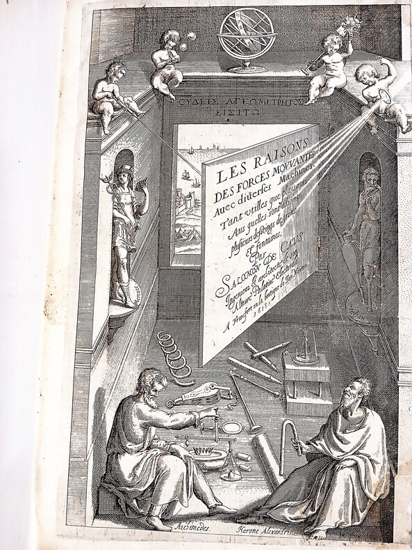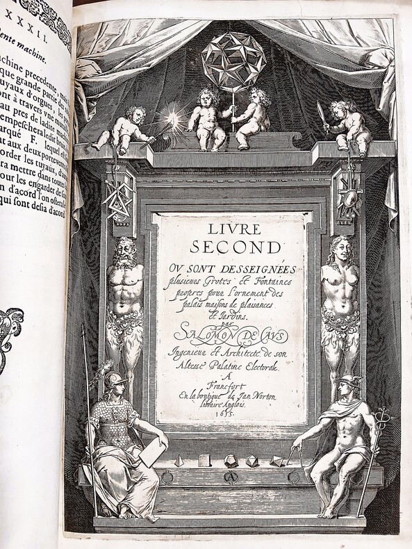 In-folio (390x260mm) dans une solide reliure plein veau raciné de l'époque, pièce de titre et caissons ornés au dos, liseré doré sur les coupes, tranches mouchetées. Contient deux ouvrages en un :- Édition originale, Salomon de Caus, Les Raisons des Forces mouvantes (1615) : 1fbnc, Livre 1- Les Raisons des Forces mouvantes (1615): 1f titre avec une gravure représentant Héron d'Alexandrie et Archimède, 3ff, 44ff, Livre 2-Où sont dessinées plusieurs Grottes et Fontaines (1615): 1ftitre gravé, 1f, 20ff; Livre 3- Traitant de la Fabrique des Orgues (1615): 1f titre, 9ff, 1f double gravé représentant un Diapason. Bandeaux, lettrines, culs-de-lampe. Glosé dans les marges à l'encre noire, dessin à la plume (Liv.1,p3). -Jacques Besson : Théâtre des Instrumens Mathématiques (1579) : 1ftitre gravé, (2ff), (16ff-Déclaration des Parties et Usages de ce Théâtre), 60 planches gravées en pleine page, 1fbnc. La première édition daterait de 1569 (considérée comme inachevée), trois éditions (une en latin, une en français, une bilingue) se sont succédé en 1578. Ouvrage fort singulier réunissant 2 oeuvres éminentes rédigées par 2 savants : Salomon de Caus (1576-1626) nommé ingénieur hydraulique -en 1605- par l'Archiduc Albert d'Autriche, et le mathématicien Jacques Besson (1540-1573) qui enseigna l'art de trouver les sources souterraines et fut le premier à publier un théâtre des machines. Salomon de Caus fut à l'origine de la huitième Merveille du monde : les jardins du château de Heidelberg, merveille matérialisée dans son ultime ouvrage: le Hortus Palatinus. En effet Salomon de Caus fut l'inventeur qui, dès 1613 à Heidelberg et ce, jusqu'en 1620 se révéla le démiurge du jardin hermétique du château royal. Salomon de Caus y construisit des grottes, des bassins, des espaces ponctués de jets d'eau et de pavillons. Le Livre premier débute par la définition des 4 éléments (terre, air, eau, feu), se poursuit par l'énoncé de 18 théorèmes et 16 problèmes, et se trouve accompagné de 21 dessins et de 32 planches hors-texte. La gravure d'une horloge à eau succède à celle d'une machine apte à faire s'élever une eau dormante. La superbe figure du mont Tmolus et cet autre représentant un Fleuve majestueux sont 2 des 20 planches du Livre 2, livre dédiée à la Princesse Élisabeth. Y figurent dessins de grottes et fontaines pour l'ornement des palais, maisons de plaisance et jardins. Le troisième et dernier livre, plus court, 8 pages seulement, traite, en une suite de 17 problèmes de la fabrique des orgues. Y sont collationnés 6 dessins et 4 gravures in-texte, en plus de la double page représentant un diapason. Quant à l'ouvrage du mathématicien Jacques Besson, c'est bien François Beroald (François Beroald de Verville, 1576-1626) qui nous invite à sa lecture. Épître dans laquelle Beroald qualifie la méchanique de fruit de la géométrie, et par conséquent le but d'icelle. Chacune des 60 propositions et commentaires de machines inventées précède 60 très belles planches hors-textes légendées en latin. Le nom de théâtre de machines étant une invention de François Béroald. Gravures de machines plus extraordinaires les unes que les autres : d'un chariot transportant autant de charge qu'un cheval, d'un compas traçant des ovales, d'une machine qui plante des poteaux obliquement. Jacques Androuet du Cerceau a gravé la plupart des 60 planches. La boucle se referme donc sur cette oeuvre dont l'auteur, mathématicien de renom, fut déjà cité par Salomon de Caus dans sa préface du Livre Premier. Reliure solide avec des manques en queue, bords inférieurs frottés, auréoles marginales dans les premier et dernier Livres.