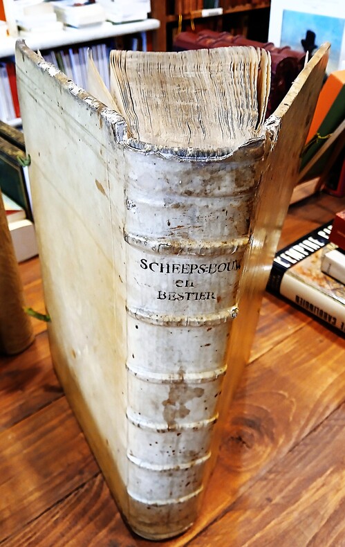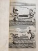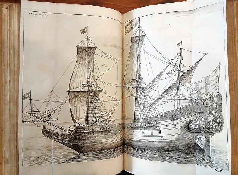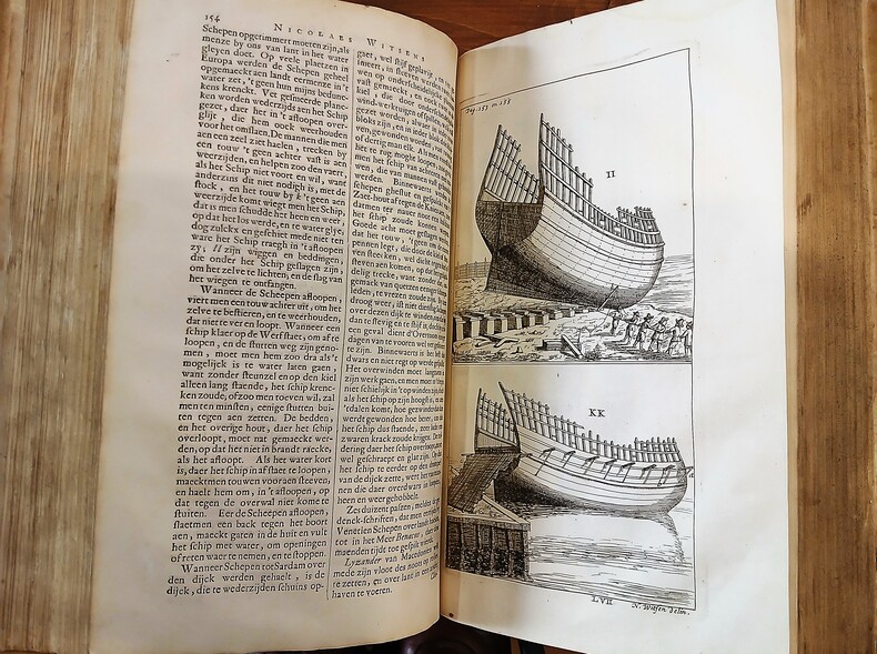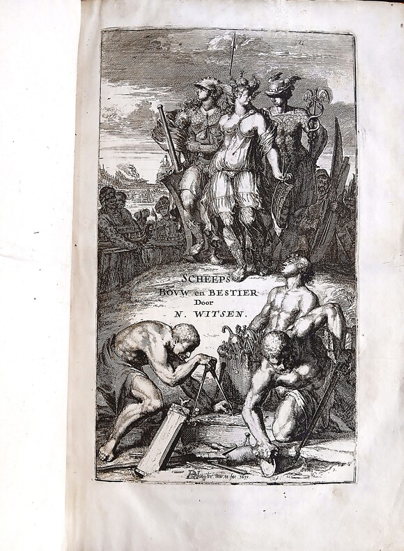Édition originale in-4 reliée (325x250mm) plein vélin, dos à 6 nerfs avec titre à l'encre noire, plats avec encadrement, motif polylobés végétalisé estampés à froid. 2fbnc, 1f frontispice gravé par Romeyn de Hooghe (artiste néerlandais, caricaturiste, 1645-1708), 1f titre bicolore en rouge et noir, vignette représentant un bateau en mer dans un ovale, (6), 516 pages, 40 pages (appendice), 2ff, 2fbnc. Agrémenté de 112 planches gravées (manquent les planches numérotées 60 et 91). Ex-libris à l'encre sur le feuillet titre signé De la Voye, texte sur 2 colonnes rédigé en néerlandais. Une autre édition paraît la même année chez Christoffel Cunradus (Amsterdam). Texte traduit en français en 1719 sous le titre L'Art de bâtir les vaisseaux et d'en perfectionner la construction. A noter que Casparus Commelijn, les frères Broer et Jan Appelaer se sont associés afin d'éditer l'ouvrage. Si Nicolas Witsen (1641-1717) occupa de multiples fonctions, conservateur du jardin botanique d'Amsterdam, bourgmestre de cette dernière pendant plus de 30 ans, directeur de la compagnie des Indes Orientales néerlandaises, il fut surtout un spécialiste reconnu en matière d'architecture navale. Considéré comme l'un des premiers cartographe de la Russie et de la Tartarie, Witsen initia le futur Pierre Ier de Russie à la construction navale. De 1664 à 1672, Witsen effectua plusieurs voyages en Russie, en Angleterre, en Italie, au cours desquels il tenait des journaux de bord. Le chapitre 15 fait une description ostentatoire des chantiers navals visités. Cité par Nicolas Aubin (Dictionnaire de marine), Jaucourt in L' Encyclopédie Diderot-D'Alembert (..ce que nous avons de meilleur en ce genre), S. Llinares (Marine et anticomanie au XVIIIè s). Coiffe de tête manquante, bords inférieurs et supérieurs frottés, auréoles claires marginales, pas de rousseurs. Exemplaire en très bon état. Original quarto edition (325x250mm) bound in full vellum, spine with 6 raised bands with title in black ink, boards with framing, vegetal polylobed motifs stamped in blind. 2 ff. blank, 1 f. engraved frontispiece by Romeyn de Hooghe (Dutch artist, caricaturist, 1645-1708), 1 f. bicolor title in red and black, vignette depicting a ship at sea in an oval, (6), 516 pages, 40 pages (appendix), 2 ff., 2 ff. blank. Includes 112 engraved plates (plates numbered 60 and 91 missing). Ex-libris in ink on the title page signed De la Voye, text in 2 columns written in Dutch. Another edition was published the same year by Christoffel Cunradus (Amsterdam). Text translated into French in 1719 under the title 'The Art of Building Ships and Perfecting Their Construction.' It should be noted that Casparus Commelijn, the Broer brothers, and Jan Appelaer partnered to publish the work. If Nicolas Witsen (1641-1717) held multiple positions—curator of the Amsterdam Botanic Garden, mayor of Amsterdam for more than 30 years, director of the Dutch East India Company—he was above all a recognized specialist in naval architecture. Considered one of the first cartographers of Russia and Tartary, Witsen introduced the future Peter I of Russia to shipbuilding. From 1664 to 1672, Witsen made several trips to Russia, England, and Italy, during which he kept travel journals. Chapter 15 provides an elaborate description of the shipyards he visited. Cited by Nicolas Aubin (Dictionnaire de marine), Jaucourt in Diderot and D'Alembert's Encyclopedia (..what we have best in this field), S. Llinares (Marine and anti-commercialism in the 18th century). Head covering missing, upper and lower edges rubbed, marginal clear halos, no foxing. Copy in very good condition.