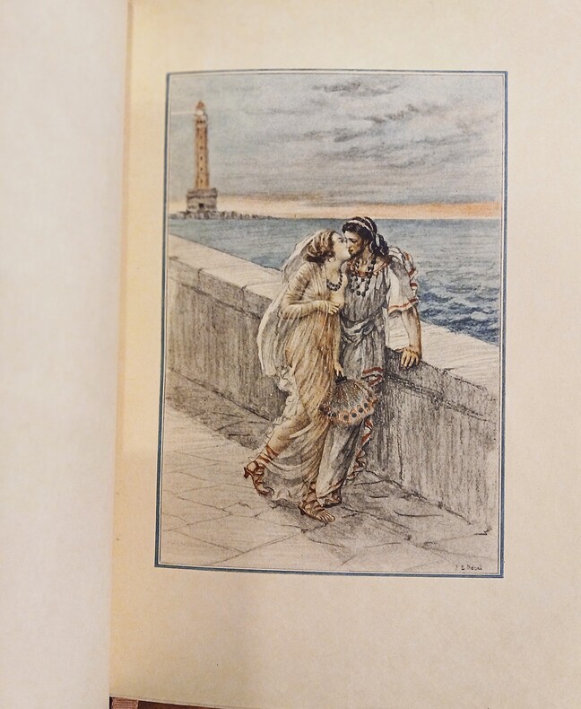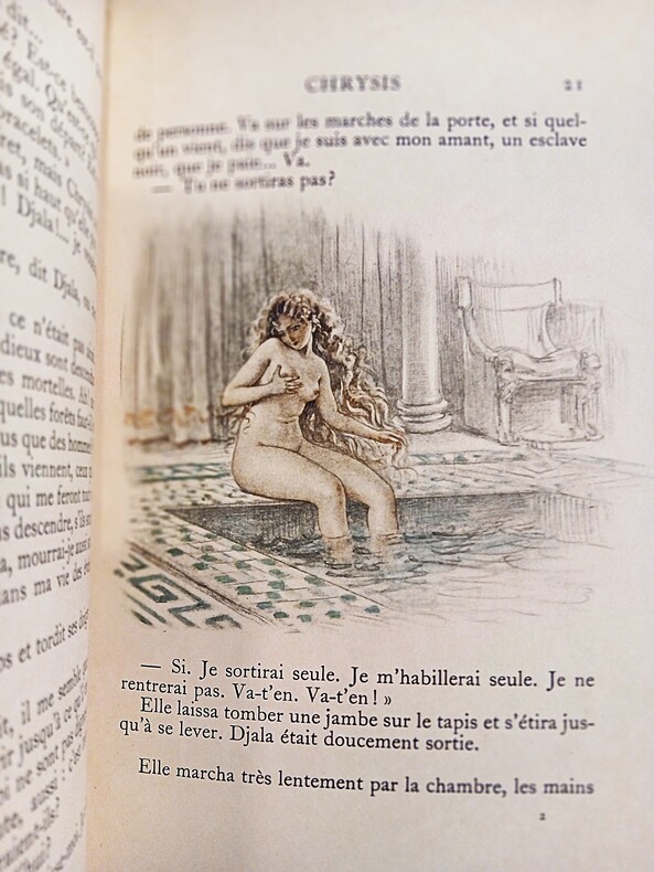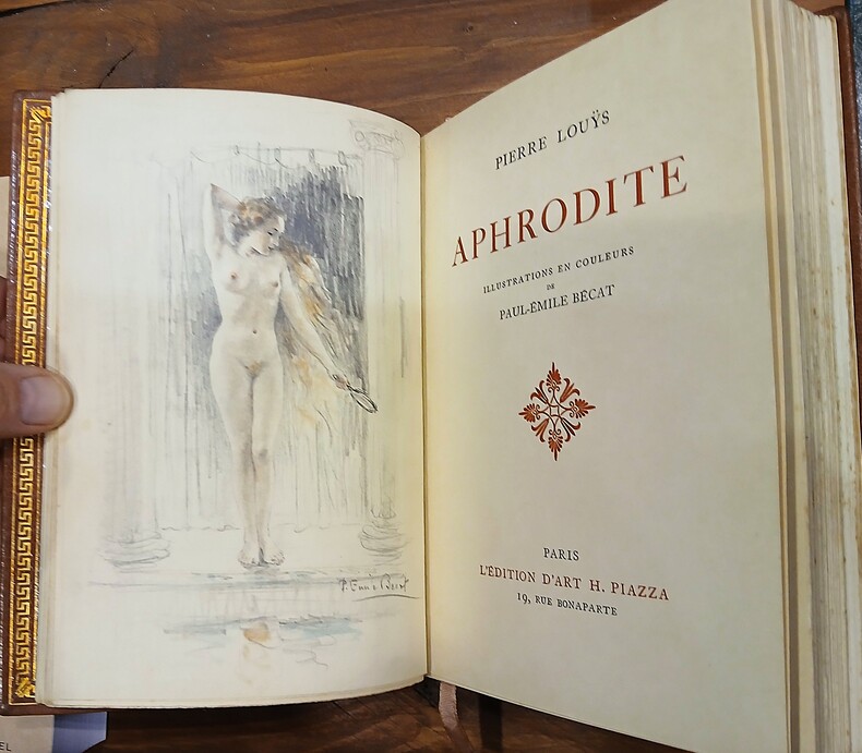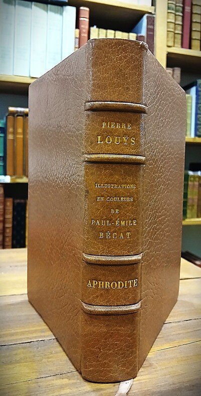 In-12 (205x140mm) élégamment et sobrement relié. Reliure plein maroquin signée Pierre-Lucien Martin (1913-1985) et Aristide-Jules Gonon (1877-1946). Dos à 4 nerfs, tranche de tête dorée, frise dorée sur les chasses, contreplats et feuillets de garde moirés. De tendance anarchiste, libraire et surtout relieur établi à Montmartre Gonon se lia dès 1913 à Paul Éluard. Élève de l'École Estienne entre 1928 et 1931, Martin se consacra à la reliure d'art et à la bibliophilie par l'intermédiaire d'Aristide Gonon. 2fbnc, couverture, 1fbnc, 1f faux-titre et justificatif, frontispice signé P. Émile Bécat, titre, dédicace à Albert Besnard, ill. hors-texte de Bécat, 248 pages, couverture, 2fbnc, suite de 44 gravures hors-texte en noir et en couleurs. Couvertures et dos conservés. Tirage numéroté (10/3200), celui-ci premier grand papier imprimé à 30 ex. sur Japon impérial, accompagné d'une suite en couleurs des illustrations et d'un dessin original rehaussé de P.-E. Bécat. Pierre Louÿs, qui n'est autre que le pseudo de Pierre Félix Louis (1870-1925) rencontre à Montpellier Paul Valéry, fréquente Mallarmé et le salon de José-Maria Heredia. Peu après la publication de son chef-d'oeuvre Les Chansons de Bilitis en 1894, Pierre Louÿs publie deux années plus tard en 1896, le roman Aphrodite-Moeurs antiques sous le titre, qui sera tôt abandonné, L'Esclavage. D'abord refusé par l'Écho de Paris et la Revue Blanche, L'Esclavage est publié en 6 numéros au Mercure de France en 1895-1896. En 1896, il sort en volume, le tirage en est vite épuisé suite à un article retentissant de François Coppée dans Le Journal : -Vous n'avez pas lu Aphrodite ! Alors qu'est-ce que vous faites entre les repas ? Sachez qu'on a rien écrit de plus parfait en prose française depuis le roman de la Momie et depuis Salammbô..- Marcel Drouin (1871-1943), un des co-fondateurs de la Nouvelle Revue Française, dans sa correspondance à Pierre Louÿs écrit : Je me suis laissé couler au fil de ton livre, et baigner dans ces eaux de délice.. Par toi j'ai su que la volupté, comme la douleur et la mort, ne doit pas être vue d'un regard oblique, mais droit dans les yeux. Elle ouvre alors aux hôtes sans vertige des royaumes aussi clairs que ceux de l'existence quotidienne, et double ainsi le domaine de la vie. Le texte Chrysis ou la cérémonie matinale (paru en 1893) allait devenir le premier chapitre du roman. Albert Besnard (1849-1934), le dédicataire, ami proche de Louÿs, portraitiste du grand monde fut sollicité une première fois pour illustrer la couverture d'Astarté. C'est le tableau Femme devant un feu de cheminée qui permit à l'auteur de découvrir le peintre. On joint un télégramme pneumatique de Pierre Louÿs adressé à Judith Gautier (1845-1917) la fille de Théophile Gautier, 30 rue Washington, daté au crayon du 30 janvier 1893. Et c'est dans une annexe de sa maison de villégiature le Pré aux oiseaux (en Bretagne) que Pierre Louÿs ébauche son roman Aphrodite. La Marchande de Sourires évoquée par l'auteur dans sa missive est une pièce de théâtre de Judith Gautier publiée en 1888. Pierre Louÿs possédait une bibliothèque de près de 20000 volumes et avait une connaissance très fine de la littérature ancienne. Passionné de bibliographie, il a rédigé des milliers de fiches, toutes cédées à son ami Frédéric Lachèvre qui reconnaissait en Pierre Louÿs un des dix-septièmistes les plus savants de sa génération. Selon Pascal Pia, il connaissait admirablement la littérature et la poésie du seizième et du dix-septième et pouvait de mémoire sans erreur citer une page du Cymbalum mundi, une ode de Ronsard, une satire de Sigogne, une facétie de Bruscambille, ou le dernier acte de Suréna. Exemplaire en très bon état.