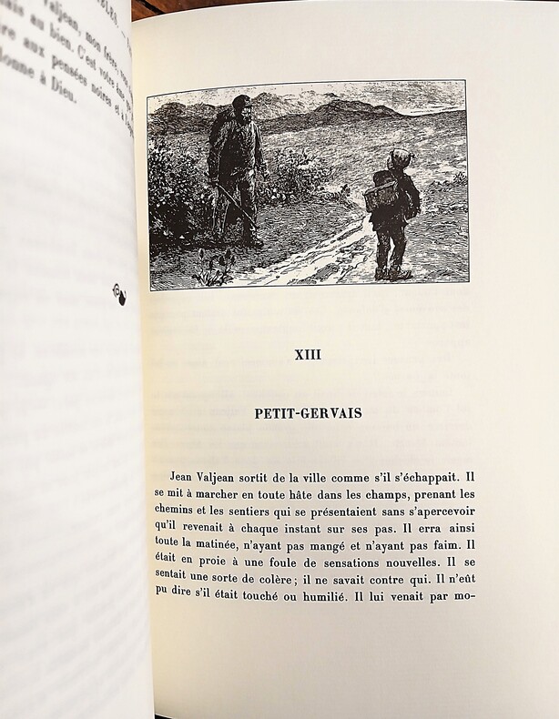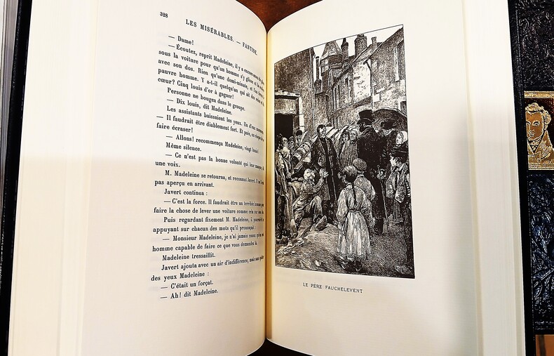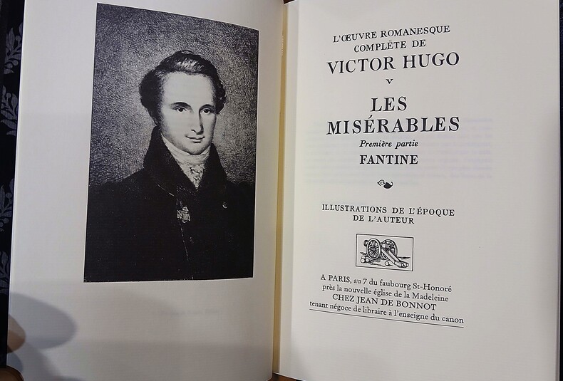Ensemble complet en 5 volumes in-8 (210x140mm) reliés Bradel, plein mouton de couleur noire estampés à froid sur les plats de motifs végétaux, dos ornés, tranches de tête dorées, portrait doré de l'auteur en médaillon sur les plats supérieurs. Volumes 5 à 9 de L'Œuvre romanesque complète de Victor Hugo, dans une reliure signée en queue Chardin. Texte accompagné des illustrations de l'époque de l'auteur en pleine page et bandeaux. Volume 1:Fantine,543 pages,3ff table; volume 2: Cosette,501pages; volume3: Marius,451pages; volume4:L'Idylle rue Plumet et L'Épopée rue Saint Denis,600pages,4ff table; volume5:Jean Valjean,523pages. Roman universel (de plus de 2500 pages) rédigé sur une période de 17 années de la vie de Victor Hugo, commencé en 1845 jusqu'en 1848 (intitulé à l'époque Les Misères) , puis repris après la révolution de 1848 en exil à Guernesey dès 1860. Hugo s'installe sur le champ de bataille de Waterloo pour achever son roman en 1860 (Mont Saint Jean 30 juin 1861). Exemplaire en très bon état.