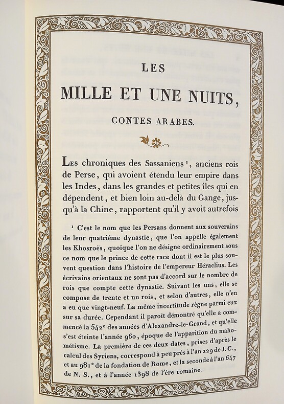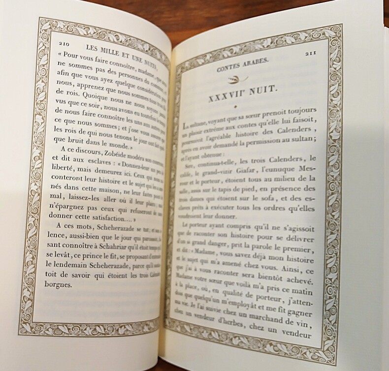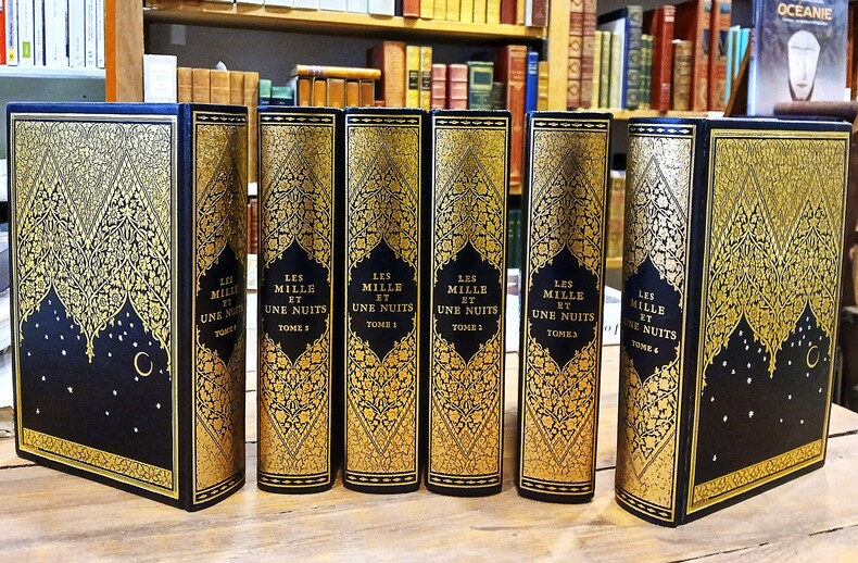 Bel ensemble complet de 6 volumes in-8 (210x140mm) dans une reliure noire à la bradel, titres dorés au dos, décor orientalisant avec un semis d'étoiles dorées sur les plats, têtes dorées. Reliure signée Charrier. Mention de tirage à part bibliophile. (xxii, notice sur Galland de Charles Nodier), 475pp; 487pp; 504pp; 526pp; 463pp; 499pp. Texte dans un encadré. La traduction d'Antoine Galland (1646-1715) rassemble les histoires de 236 Nuits (regroupées au cœur des 3 premiers volumes), les Sept voyages de Sindbad le Marin, l'Histoire d'Aladdin ou la Lampe merveilleuse, l'Histoire d'Ali Baba et de quarante voleurs exterminés par une esclave, les Aventures du Cadi et de sa femme, l'Histoire d'un fou.. Auteur de La mort du Sultan Osman (Cologne, 1678), Les contes et fables indiennes de Bidpaï et de Lokman (Paris, 1724) et des Mille et une Nuits (parues entre 1704 et 1712), dont les 2 derniers tomes XI et XII sont posthumes; Antoine Galland n'a pu voir la publication entière des Contes. Savant en langues orientales (il apprend le grec, l'hébreu, le turc, l'arabe et le persan), Galland rentre définitivement à Paris où il travaille pour la bibliothèque de Barthélémy d'Herbelot. Il se fondera, pour sa traduction, sur un manuscrit en 3 volumes (datés du XVè siècle), l'un des plus anciens témoignage des Contes qui contient le récit-cadre mettant en scène Schéhérazade suivi des 282 premières nuits et se termine au milieu du conte de Qamar al-Zaman. Sa traduction mêlant liberté stylistique et volonté d'exactitude, y intègre ceux d'un certain Hanna Diab, chrétien maronite de passage à Paris. Ensemble en très bon état.