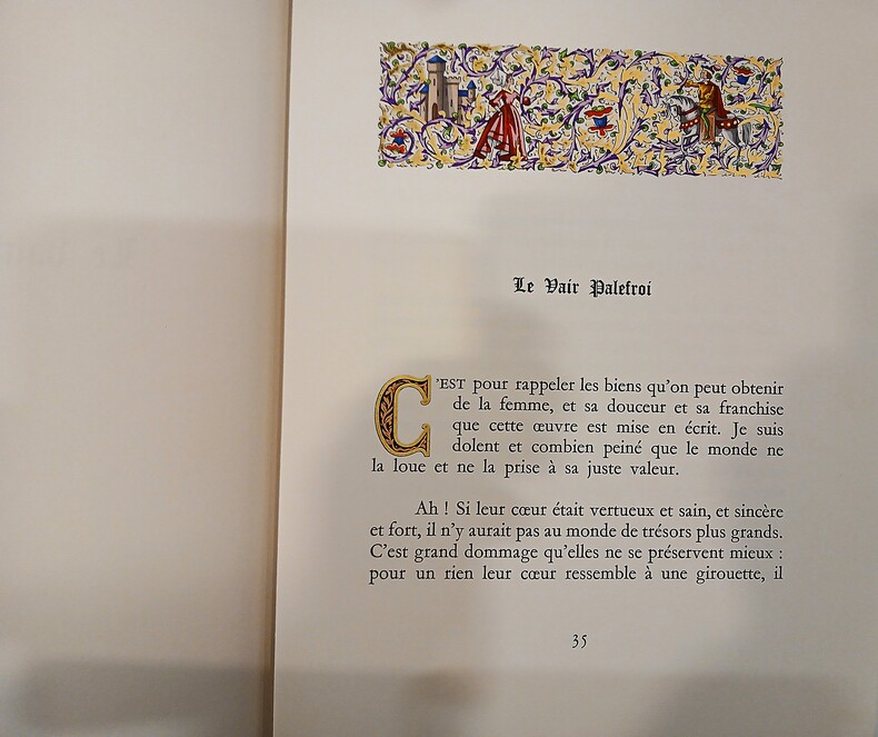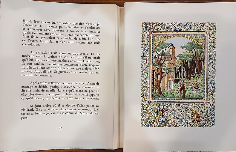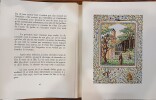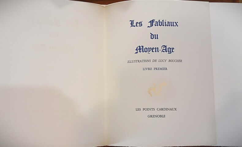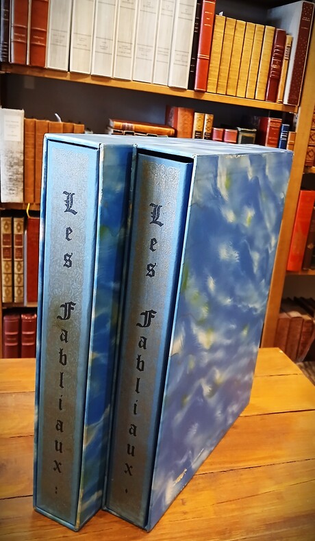 Les Fabliaux du Moyen-Age (2vol), illustrés par Lucy Boucher. A Grenoble, Éditions Les Points Cardinaux, s.d. (1967-1968). Bel exemplaire complet en 2 grands volumes in-4 (360x275mm), sous étui et chemises cartonnés de couleur bleue titrés au dos, en feuillets libres sous une chemise rempliée. 152pp, 183pp. Adaptation de l'écrivain Guy Cantin. Finement illustré en couleurs par la talentueuse miniaturiste Lucy Boucher. Volume 1 : 10 illustrations en pleine page accompagnées de 6 bandeaux, 6 lettrines et de 4 illustrations in-texte. Le volume 2: 10 illustrations en pleine page accompagnées de 10 bandeaux et 10 lettrines. Exemplaire nominatif numéroté (84/480), celui-ci un des 430 exemplaires. Les fabliaux du Moyen-Age choisis ici -sans doute issus d'une tradition orale celte- sont les plus représentatifs du génie populaire. Se succèdent les contes suivants, Vol1: La Housse partie, Le Vair palefroi, Le Vilain mire, Le Chevalier au Barizel, Brumain, La vache du Curé, Les trois aveugles de Compiègne; Vol2: Saint-Pierre et le jongleur, Les trois bossus ménestrels, Guillaume au faucon, Le vilain qui conquit le Paradis en plaidant, Les trois larrons, Les trois chevaliers et le chainse, Le dit des perdrix, Le vilain au buffet, Le Chevalier à la robe vermeille. ''Je vais vous conter l'aventure qui arriva à un bourgeois d'Abbeville, il y a une vingtaine d'années. C'était un homme très riche et comblé de biens. Il décida de quitter son pays..'' (in, La Housse partie). Étuis avec marques d'usure, int. en parfait état.