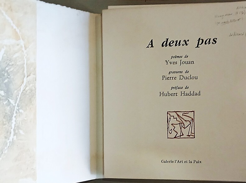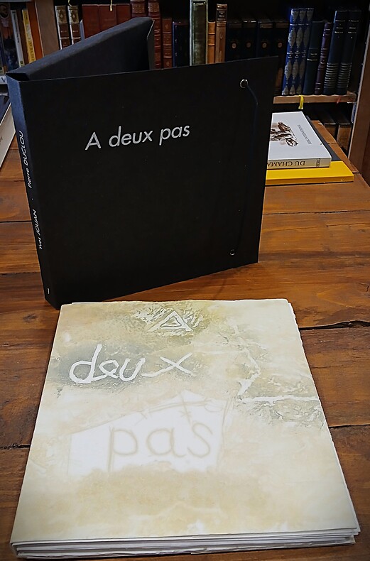 Livre d'artiste, édition originale au format carré (20x20cm), étui cartonné remplié avec titre imprimé au dos et sur le plat supérieur, couverture rempliée imprimée, en feuillets libres non numérotés. Accompagné de 7 gravures (sur 8 mentionnées) sous serpente en pleine page et en couleurs de l'artiste Pierre Duclou (né en 1957). Dès le début des années 80 Pierre Duclou non seulement recycle et fabrique sa propre pâte à papier mais crée des ouvrages originaux sur papier à l'acrylique ainsi que des livres objets ayant pour thématique le totem. Dans un même temps il adopte la technique de gravure au carborundum (technique élaborée par Henri Goetz, Max Papart, James Coignard dans les années 60). ''Duclou travaille ici à la révélation du palimpseste sur le mur des âmes''. Dédicacé et signé par l'auteur et l'artiste le 16 septembre 1995 à la fête de l'Humanité à Paris. Tirage numéroté (7/90), celui-ci un des 75 exemplaires tiré sur Moulin du Gué 300g signé par le poète et l'artiste. Préface de Hubert Haddad (poète né en 1947) aux 7 poèmes de Yves Jouan où ''la pierre tient mon souffle dans son cercle''. Exemplaire en très bon état.
