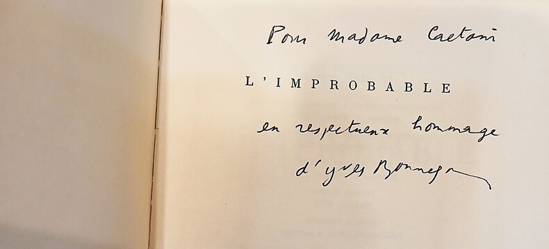 Édition originale imprimée sur papier courant, in-8 broché (190x140mm), 190 pages. Exemplaire dédicacé et signé par l'auteur sur le deuxième feuillet. Yves Bonnefoy (1923-2016) ne fut pas seulement le poète que l'on connait (Les Planches courbes -2003, Du mouvement et de l'immobilité de Douve-1953), il fut aussi l'auteur de livres d'artiste avec Raoul Ubac (Pierre écrite), Joan Miro (Anti-Platon), Alechinsky ainsi que traducteur (de Yeats, Shakespeare, Léopardi, Pétrarque) et professeur au Collège de France titulaire de la chaire d'Études comparées de la fonction poétique de 1981 à 1993. Dans les années 50 il effectue de nombreux voyages en Italie et suit à l'École Pratique des Hautes Études le séminaire d'André Chastel. Ce recueil constitué d'une dizaine d'essais médite et met en relief les Fleurs du mal de Charles Baudelaire, les figures tutélaires artistiques et littéraires majeures de Raoul Ubac, Balthus, Paul Valéry et quelques figures du Quattrocento Masaccio, Uccello; enfin les prestigieux Tombeaux de Ravenne. Dos passé, charnière légèrement fendillé, intérieur en bon état.