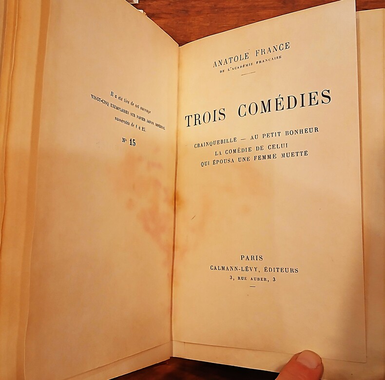 Ce livre regroupe en un seul vomume tiré à 1000 exemplaires sur papier Outhenin Chalandre numérotés (N°899) les trois premières pièce de théâtres d'Anatole France: Crainquebile (écrit en 1903) Au petit bonheur (écrit en 1898) La comédie de celui qui épousa une femme muette (de 1908) Edité sd dans les années 30 (1932?) elle est établie dans une fine reliure en demi-chagrin brun sombre à coins, dos à quatre nerfs avec pavé titre et auteur en cuir brun clair, en bon état (légère insolation du dos, légers frottements en coins, aux coiffes et aux mors et qqes taches de décoloration). intérieur en parfait état.