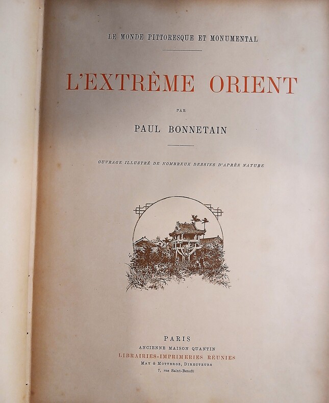 Cartonnage éditeur in-4 (300x210mm) pleine percaline rouge, titres au dos et date en queue, joli plat historié et doré de Paul Souze, tranches dorées. 521 pages accompagné de très nombreux dessins d'après nature de H. Danger, E. Bondice, Boudier, Eugène Chaperon.. dans le texte. 2 planches doubles : Panorama de Macao et Panorama de Hong-Kong (p340-341 et p348-349). Table des matières in fine. Collection Le Monde pittoresque et monumental. Ouvrage de vulgarisation ayant trait à l'Extrême-Orient scindé en 3 parties, l'Indo-Chine, l'Empire chinois et le Japon. Correspondant de guerre pour le Figaro, Paul Bonnetain (1858-1899) qui a débuté très tôt sa carrière d'écrivain -en 1882 avec Le Tour du monde d'un troupier-, embarque en 1884 pour l'Indochine. Paraîtront successivement ''Au Tonkin''(1884), ''L'Opium'' (1886), puis L'Extrême Orient (1887). Qualifié d'écrivain naturaliste, Paul Bonnetain qui a pour correspondants Émile Zola et les frères Goncourt, souhaite dans ses ouvrages faire une description ''exacte et scientifique des milieux sociaux''. Description physique, géographique, historique, des moeurs et des coutumes des différents pays. Dos insolé, manques au niveau des coiffes, coins élimés.