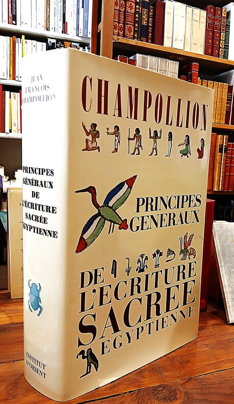 Institut d'Orient/Michel Sidhom, Paris, 1984. Fort in-4, reliure pleine toile éditeur sous jaquette illustrée en couleurs, 555 pp.Fac-similé de l'édition de 1836. Préface de la nouvelle édition, par Christiane Ziegler - Notice sur la fabrication de cet ouvrage - Grammaire égyptienne ou Principes généraux de l'écriture sacrée égyptienne appliquée à la représentation de la langue parlée, par Champollion le Jeune.