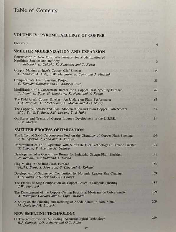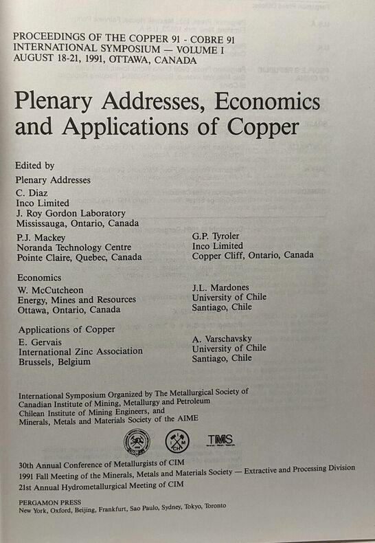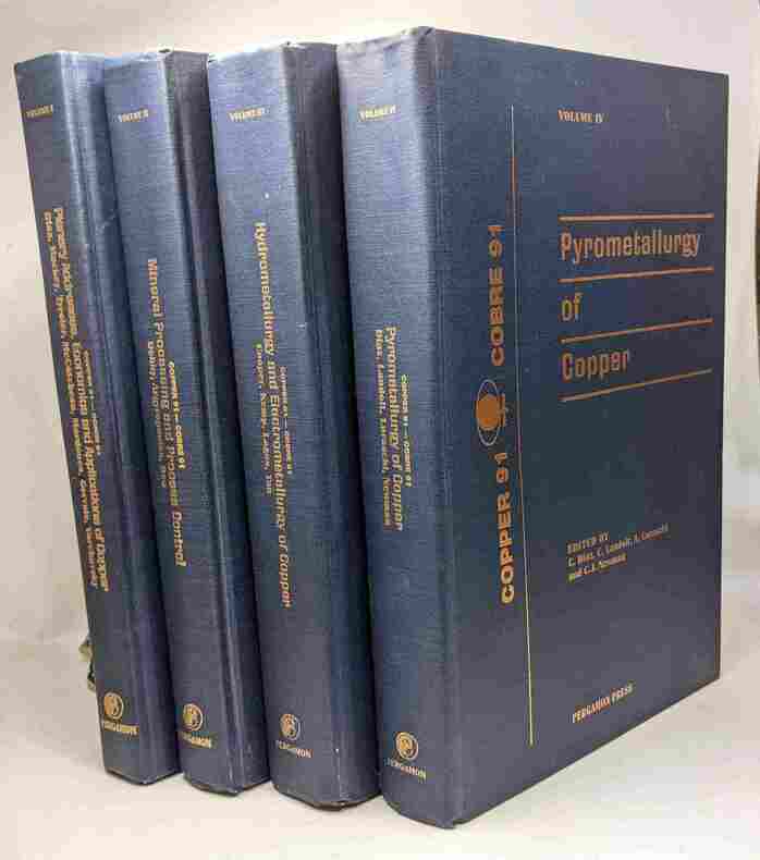 Pergamon Press 1992 4 pages 18x25x4cm. 1992. Cartonné. 4 volume(s). 4 pages. Copper '91 - I/ Planery Addresses Economics and Applications of Copper II/ Mineral processing and process control III/ Hydrometallurgy and electrometallurgy of Copper IV/ Pyrometallurgy of Copper - 4 volumes