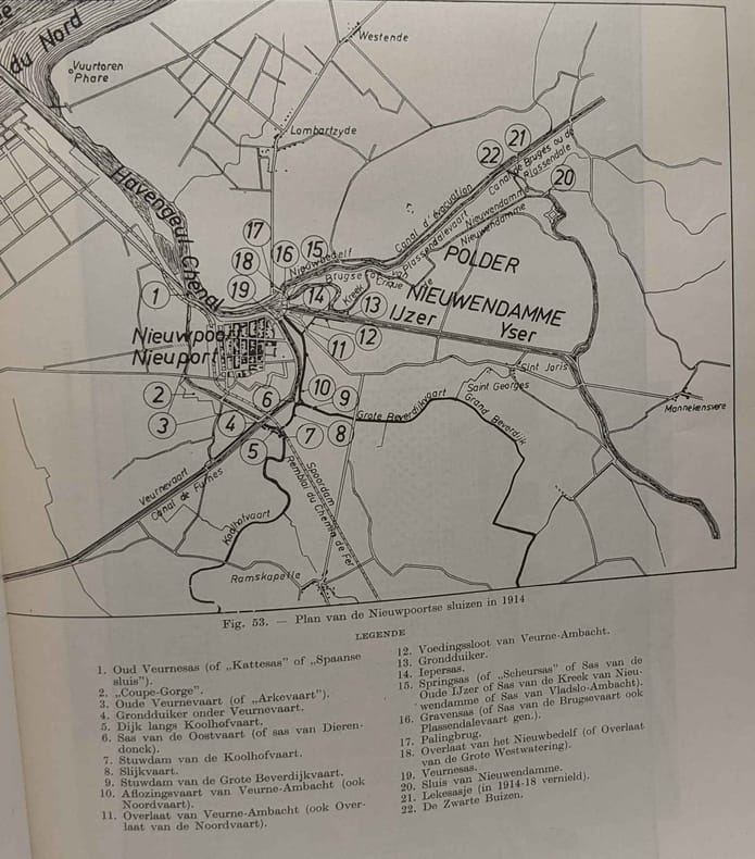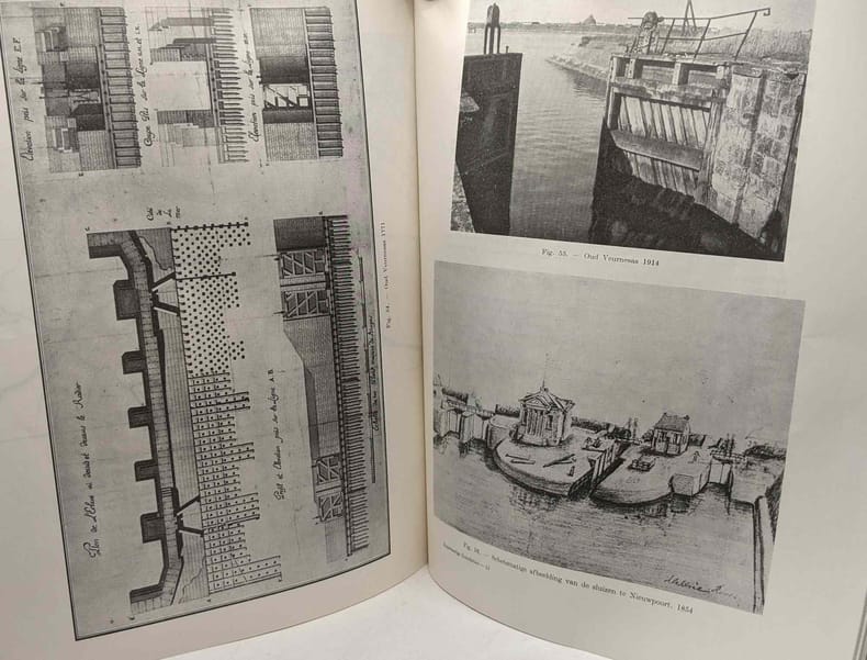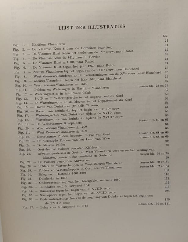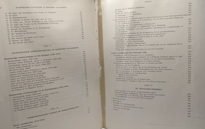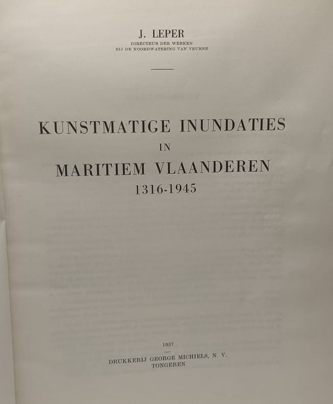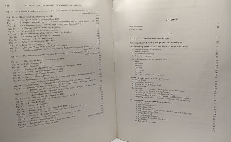 Tongeren, Drukkerij George Michiels, 1957, in-4°, 27,5 x 22 cm, 327 pp, b/w ills., folding maps. Sewn, orig. stiff wrapper. Exhaustive historical study of the man-inflicted floodings of coastal Flanders: from Calais to Bruges. These floodings were almost always done for military purposes. Rare. Text in Dutch.