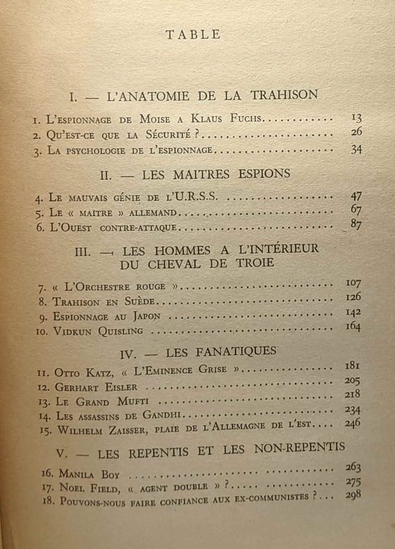 Cet ouvrage retrace les activités des espions célèbres. Quatre hommes, en particulier, ont fait l'histoire secrète : le Russe Lavrenti Beria, l'amiral Canaris, qui fut peut-être le plus grand organisateur d'espionnage de tous les temps, l'Anglais Sir Percy Sillitoe, et Allen Welsh Dulles (frère du ministre des Affaires étrangères américain et chef des services de renseignements des Etats-Unis). Pour la première fois, cet ouvrage contient l'histoire complète de la vie de Beria ainsi que celle de Richard Sorge qui prévint les Russes de l'attaque de Pearl Harbor ; celle d'Otto Katz qui prépara l'assassinat de Trotsky ; celle de "l'Orchestre rouge" ; de Quisling ; de Gerhart Eisler dit "le fouet" ; de Noël Field dont la disparition reste mystérieuse ; du général William Zaisser exécuteur des hautes oeuvres de Malenkov ; de Manila Boy, qui lutta d'abord contre le gouvernement de son pays, puis lui offrit son aide pour soumettre les rebelles communistes des Philippines, etc.