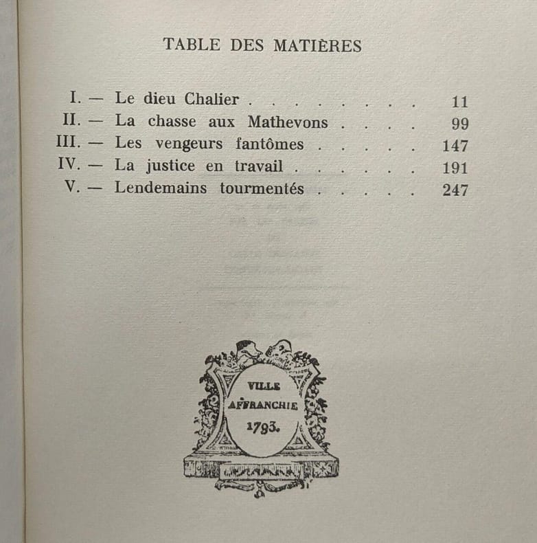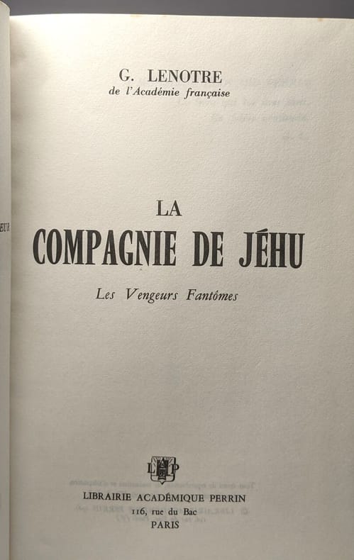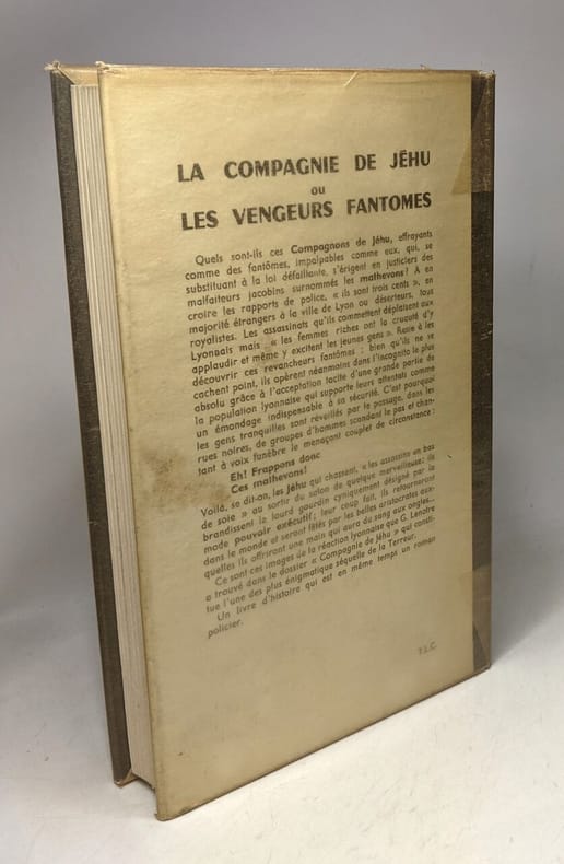 Les « Compagnies de Jéhu » furent formées par des royalistes. Elles se constituent dans la région de Lyon en 1795 et pourchassent les Jacobins compromis dans la Terreur qui à Lyon et dans sa région a fait plusieurs milliers de victimes. On estime à plusieurs centaines les victimes de ces « Compagnons de Jéhu ». Le 4 mai 1795, 99 « terroristes » sont massacrés dans les prisons de Lyon par des envahisseurs furieux mais dûment encadrés par des meneurs royalistes. Les jours suivants, la violence contre-révolutionnaire se banalise, et les meurtres se poursuivent, avec moins d'ampleur, sous la forme de bastonnade mortelle, d'égorgements à domicile ou sur la voie publique, de noyades. vol relié toile, sous couverture illustrée ( usures au dos), 21x15, état intérieur neuf, 294pp Perrin, 1962 ref/111