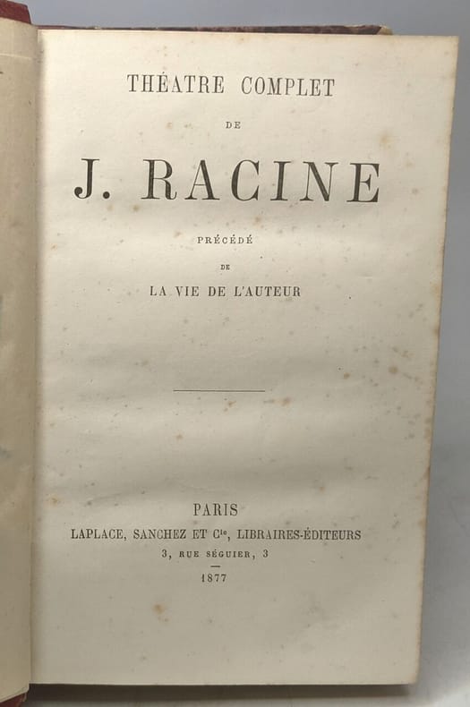 Laplace Sanchez et Cie. 1880. In-12. Relié demi-cuir. Etat d'usage, Coins frottés, Dos abîmé, Quelques rousseurs. VII + 625 pages - quelques gravures en couleurs hors texte sous serpente dont une en frontispice - plats et contre plats jaspés - titre, auteur, filets, fleurons dorés sur le dos - étiquette collée sur le dos - coins, tranches et plats légèrement frottés - tampons sur la page de titre.. . . . Classification Dewey : 792-Théâtre