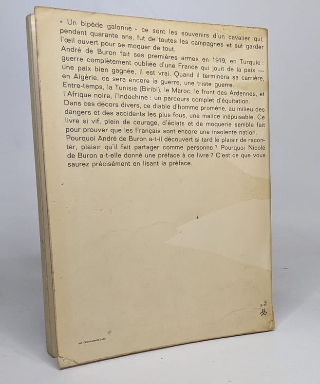 « Un bipède galonné » ce sont les souvenirs d'un cavalier qui, pendant quarante ans, fut de toutes les campagnes et sut garder l'œeil ouvert pour se moquer de tout. André de Buron fait ses premières armes en 1919, en Turquie, guerre complètement oubliée d'une France qui jouit de la paix – une paix bien gagnée, il est vrai. Quand il terminera sa carrière, en Algérie, ce sera encore la guerre, une triste guerre. Entre-temps, la Tunisie (Biribi), le Maroc, le front des Ardennes, et l'Afrique noire, l'Indochine : un parcours complet d'équitation. Dans ces décors divers, ce diable d'homme promène, au milieu des dangers et des accidents les plus fous, une malice inépuisable. Ce livre si vif, plein de courage, d'éclats et de moquerie semble fait pour prouver que les Français sont encore une insolente nation. Pourquoi André de Buron a-t-il découvert si tard le plaisir de raconter, plaisir qu'il fait partager comme personne ? Pourquoi Nicole de Buron a-t-elle donné une préface à ce livre ? C'est ce que vous saurez précisément en lisant la préface. — France, régions sahariennes, Levant (1918-1921). Saumur, Tunisie (1922-1930). Maroc (1930-1934). Saumur, Saint-Avold (1934-1937), Algérie (1937-1939), Front de France, Sud tunisien, Algérie (1939-1942). Afrique noire (1942-1943). Italie (1944). France (1945-1946). Indochine (1946-1948). Tunisie (1948-1951). Algérie (1951-1956).
