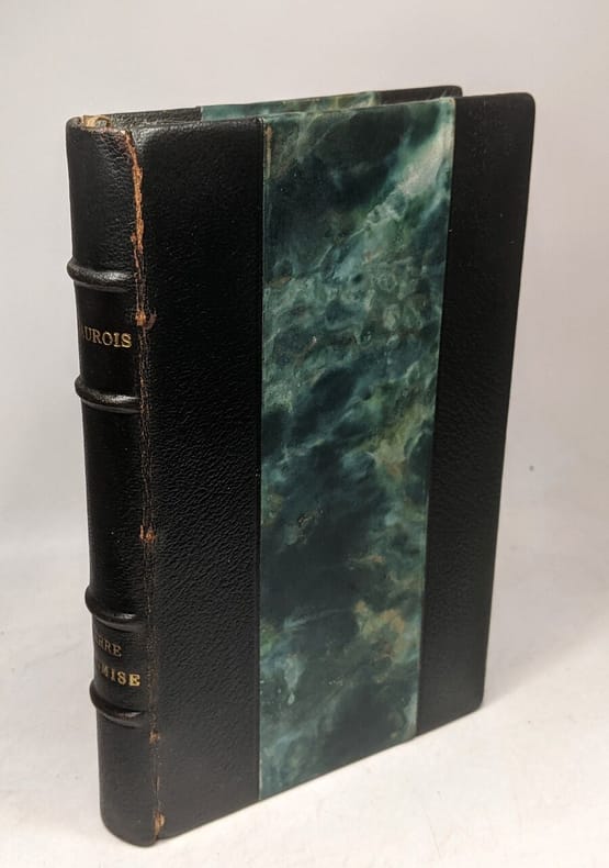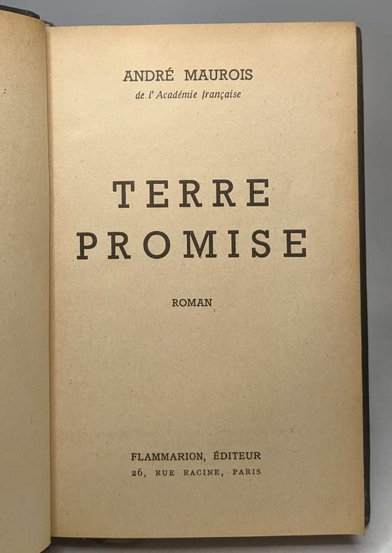 Titre : Terre promise Auteur : Maurois André Éditeur : Flammarion Lieu d'édition : Paris, 26 rue Racine Date : 1945 (copyright Éditions de la Maison Française, Inc., New York) - imprimé en France Reliure : Demi-basane brune, dos à nerfs, plats marbrés vert et crème Etat du livre : Bon état - dos patiné, légers frottements aux coiffes et aux mors, coins un peu émoussés, intérieur uniformément jauni avec discrètes rousseurs, reliure solide Jaquette : Sans jaquette (éditeur) Format : in-12 env. - 18 x 12 cm Langue : Français Particularités : Page de tirage présente mentionnant un tirage limité sur divers papiers (pur fil Outhenin-Chalandre, chiffon blanc Lana, papier alfa, sélections Lardanchet). Exemplaire non numéroté visible. Roman. Description : Bel exemplaire ancien de « Terre promise » d'André Maurois, publié par Flammarion. Joli cartonnage d'époque en demi-basane avec plats marbrés. Titre en capitales sur page de titre, mention de l'Académie française. Impression soignée, papier d'époque.