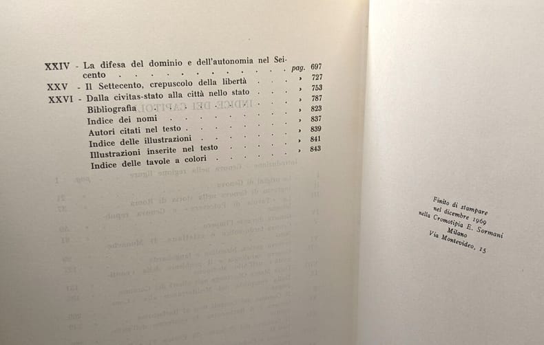 Libri Quattro. Leida (ma Modena), 1750. In-4 p. (mm. 300x203), mz. pergamena ottocentesca, tit. oro su tassello al dorso, pp. (2),563, frontespizio con tit. in rosso e nero e vignetta incisa in rame, completo della grande e bella "Carta topografica de' contorni di Genova e delle due valli di Polcevera e Bisagno con sue adiacenze", più volte ripiegata ed inc. in rame da Giuseppe Benedetti. Seconda e importante edizione, accresciuta del quarto libro, della storia degli avvenimenti che coinvolsero la città di Genova dal 1745 al 1749 (la prima è del 1743).Cfr. Melzi,III, p. 109 - Lozzi,I,2096 - Coleti,I,30.Prime 3 cc. con tracce d'uso, altrimenti fresco esemplare con barbe, molto ben conservato.