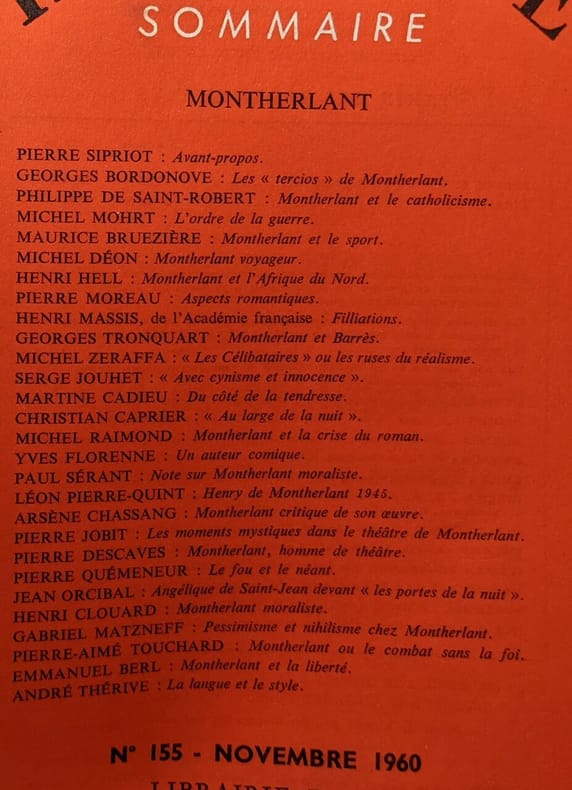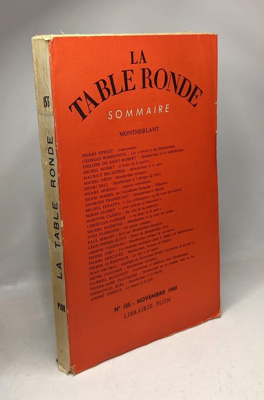 Sommaire : MONTHERLANTPIERRE SIPRIOT : Avant-propos.GEORGES BORDONOVE : Les « tercios » de Montherlant.PHILIPPE DE SAINT-ROBERT : Montherlant et le catholicisme. MICHEL MOHRT : L'ordre de la guerre.MAURICE BRUEZIÈRE : Montherlant et le sport.MICHEL DÉON : Montherlant voyageur.HENRI HELL : Montherlant et l'Afrique du Nord.PIERRE MOREAU : Aspects romantiques.HENRI MASSIS, de l’Académie française : Filliations.GEORGES TRONQUART : Montherlant et Barrés.MICHEL ZERAFFA : « Les Célibataires » ou les ruses du réalisme. SERGE JOUHET : « Avec cynisme et innocence ».MARTINE CADIEU : Du côté de la tendresse.CHRISTIAN CAPRIER : « Au large de la nuit ».MICHEL RAIMOND : Montherlant et la crise du roman.YVES FLORENNE : Un auteur comique.PAUL SÉRANT : Note sur Montherlant moraliste.LÉON PIERRE-QUINT : Henry de Montherlant 1945.ARSÈNE CHASSANG : Montherlant critique de son œuvre.PIERRE JOBIT : Les moments mystiques dans le théâtre de Montherlant. PIERRE DESCAVES : Montherlant, homme de théâtre.PIERRE QUÉMENEUR : Le fou et le néant.JEAN ORCIBAL : Angélique de Saint-Jean devant « les portes de la nuit ». HENRI CLOUARD : Montherlant moraliste.GABRIEL MATZNEFF : Pessimisme et nihilisme chez Montherlant. PIERRE-AIMÉ TOUCHARD : Montherlant ou le combat sans la foi. EMMANUEL BERL : Montherlant et la liberté.ANDRÉ THÉRIVE : La langue et le style. Classification Dewey : 70.49-Presse illustrée, magazines, revues